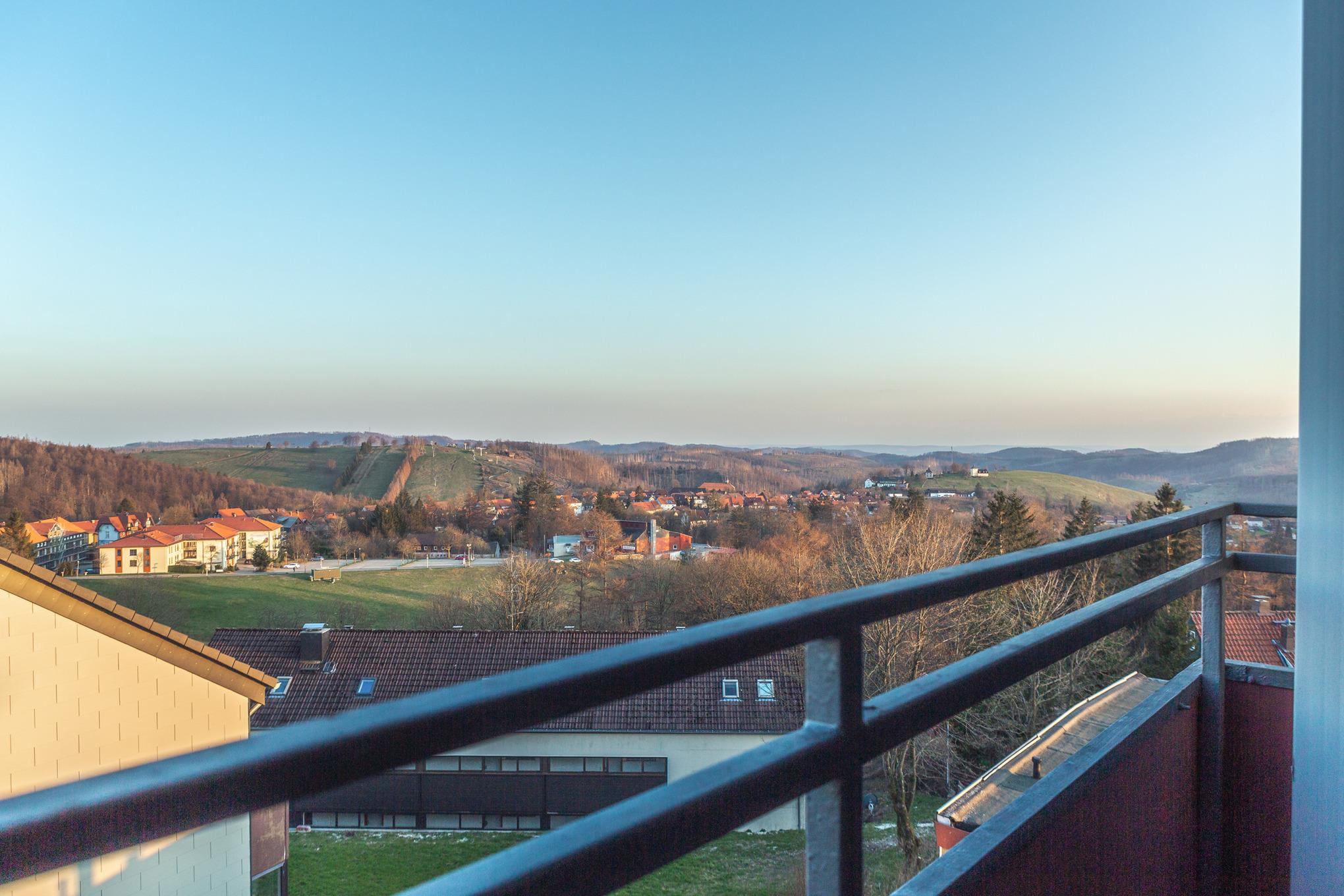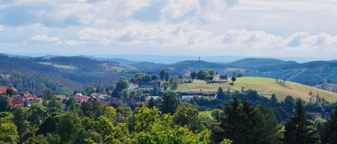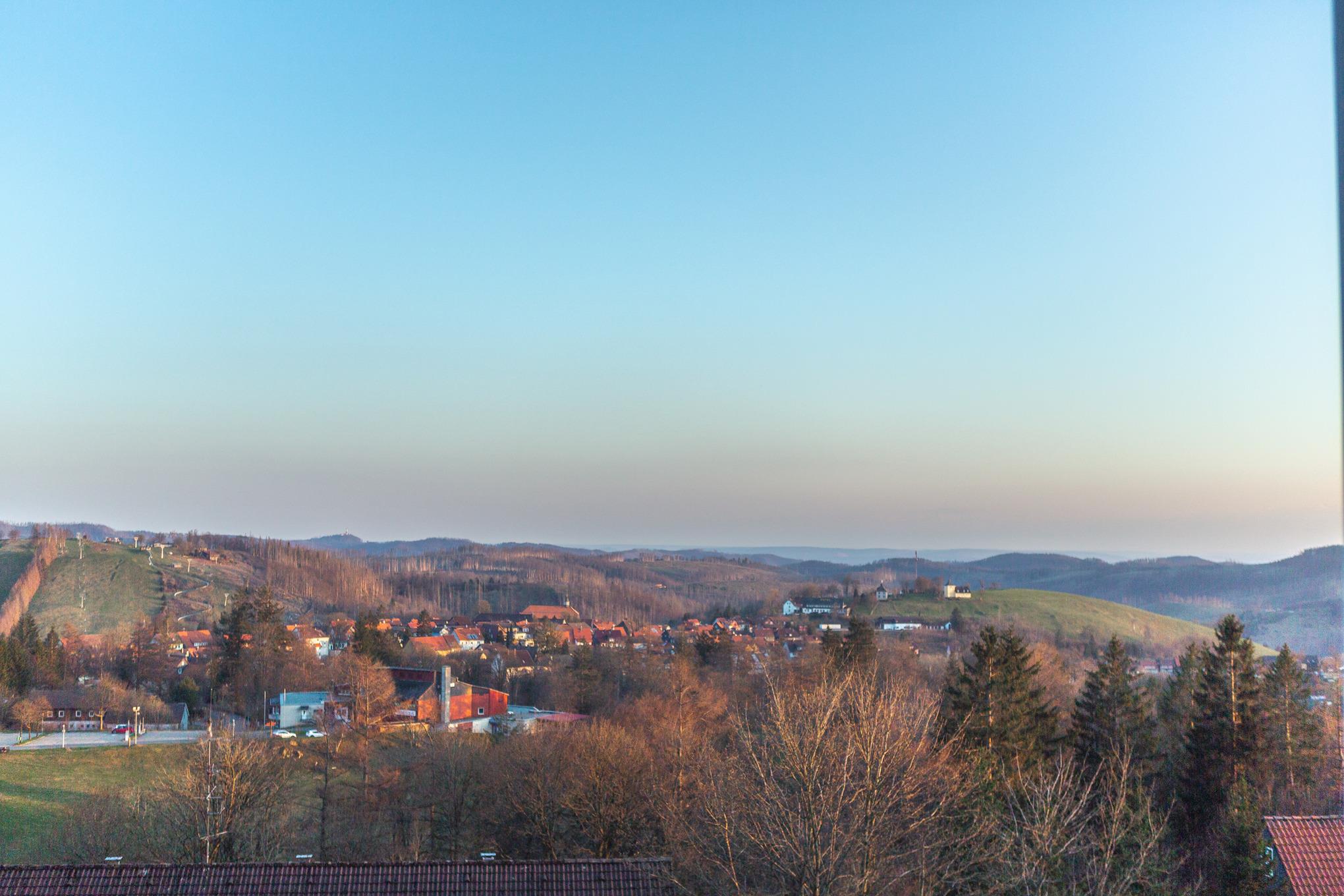 Auf sie wartet ein wunderbarer Ausblick über Sankt Andreasberg, mit Blick auf den Nahe gelegenen Matthias Schmidt Berg und den Glockenturm.