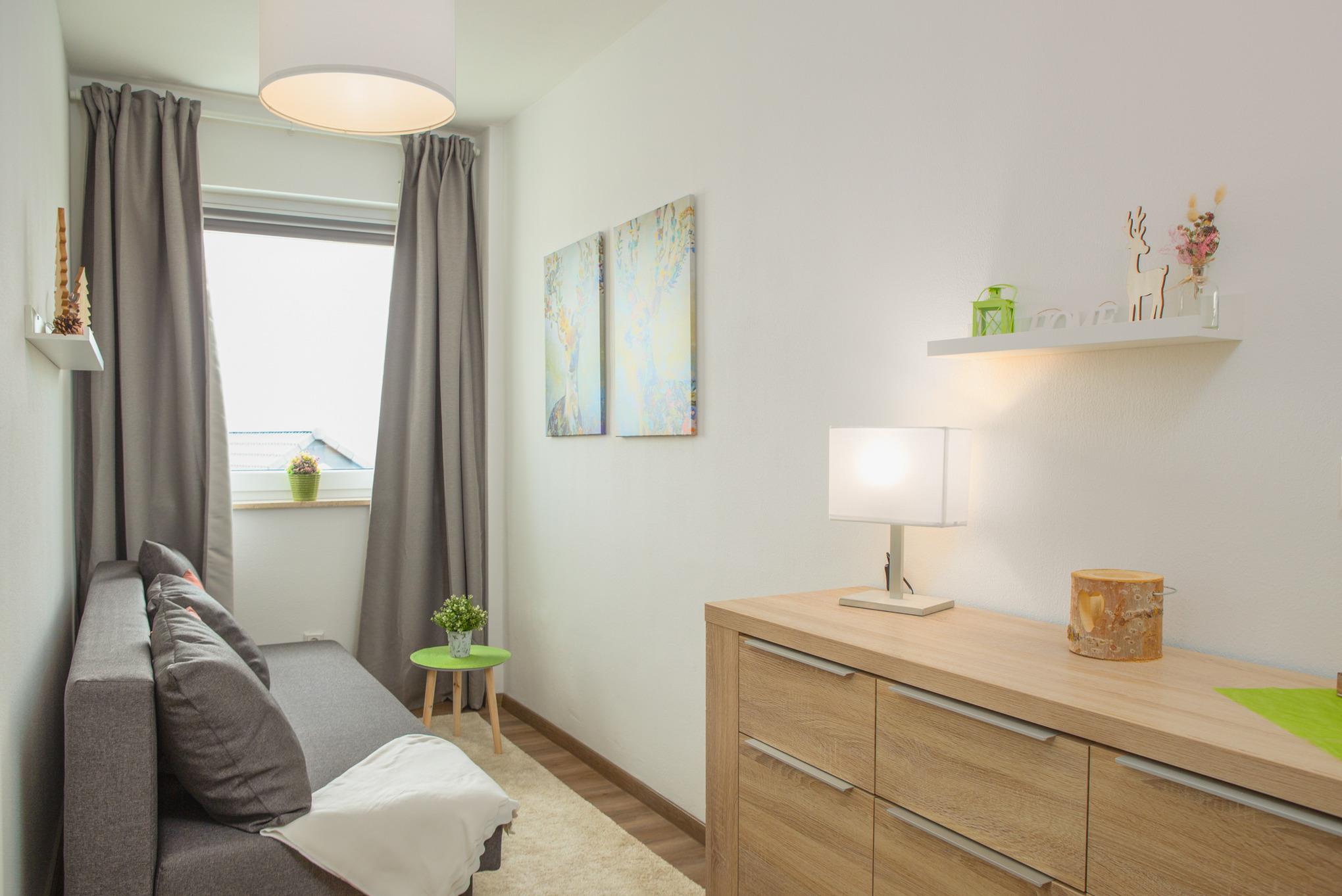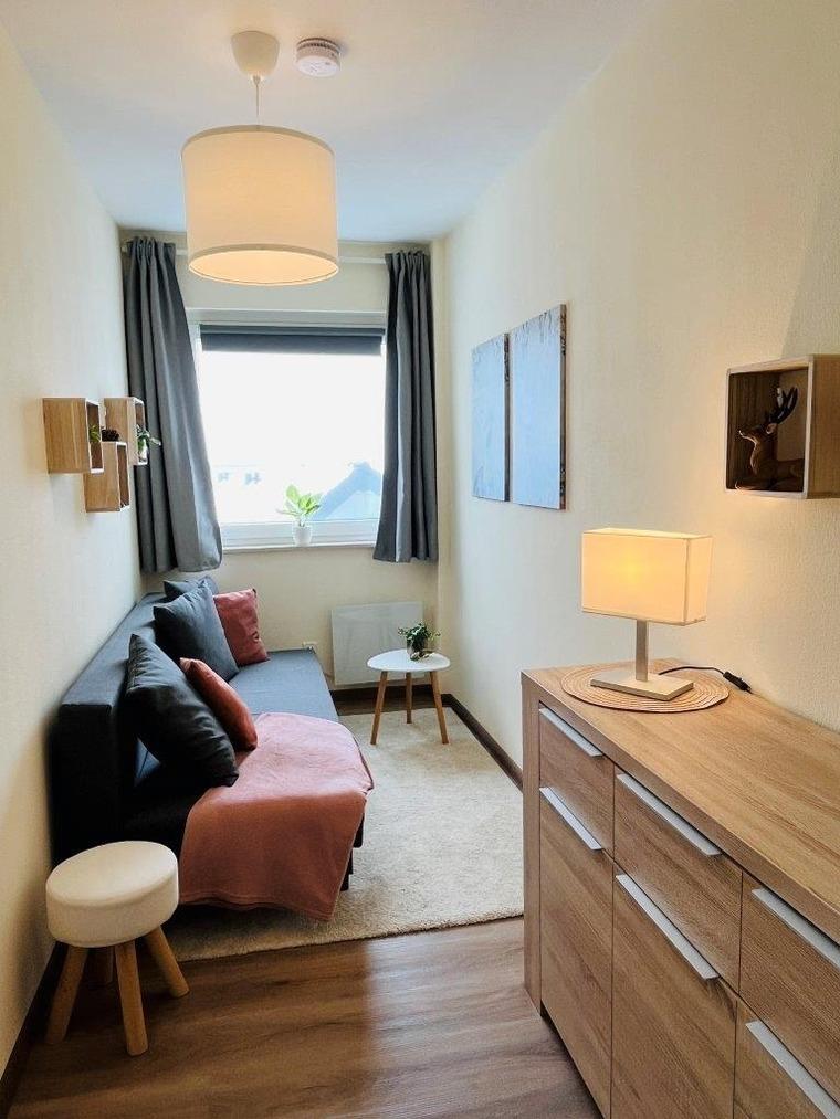 Es gibt ein Gästezimmer mit Schlafcouch (Liegefläche 1,30 x 1,90) und kleiner Komode und ein Schlafzimmer mit Doppelbett (1,80m x 2,00m) und Kleiderschrank.