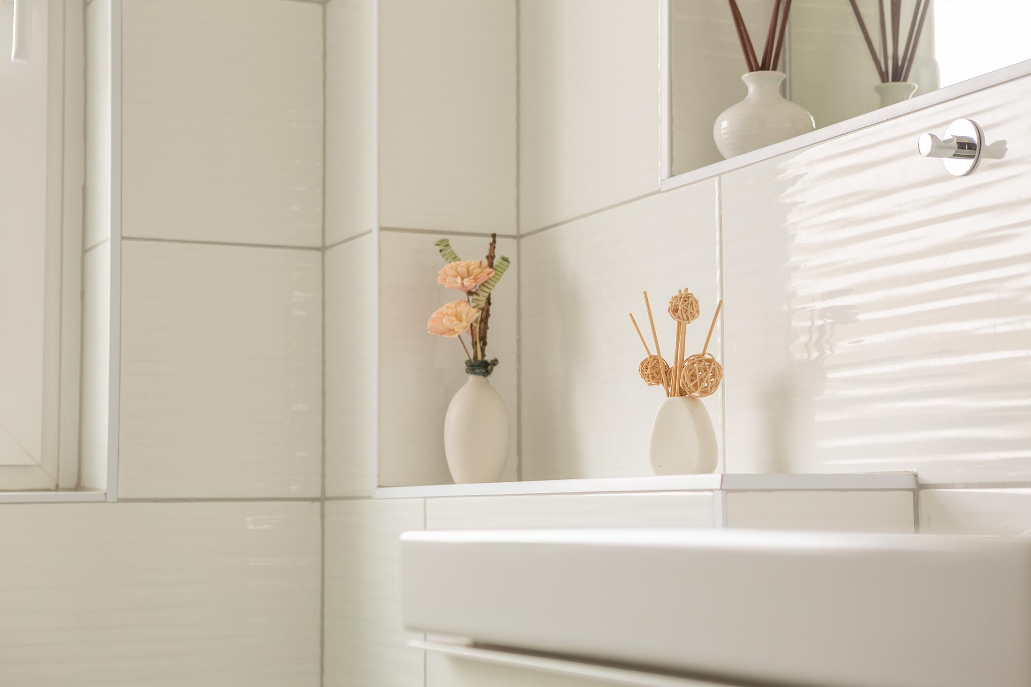 Das Badezimmer mit Fenster verfügt über Dusche, WC, Waschtisch und Spiegel.