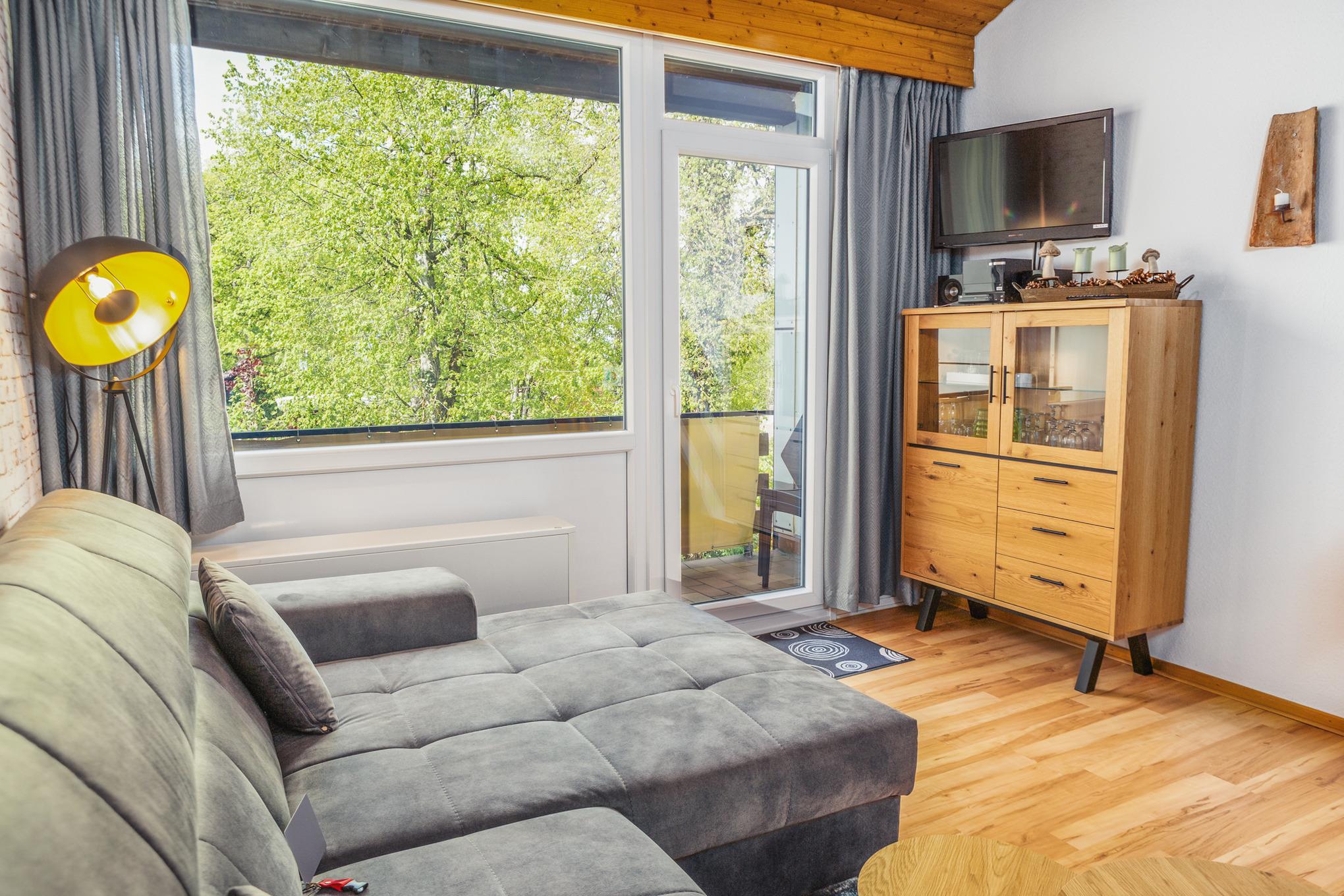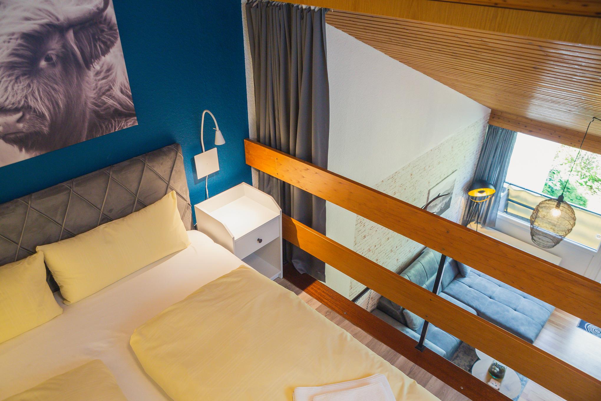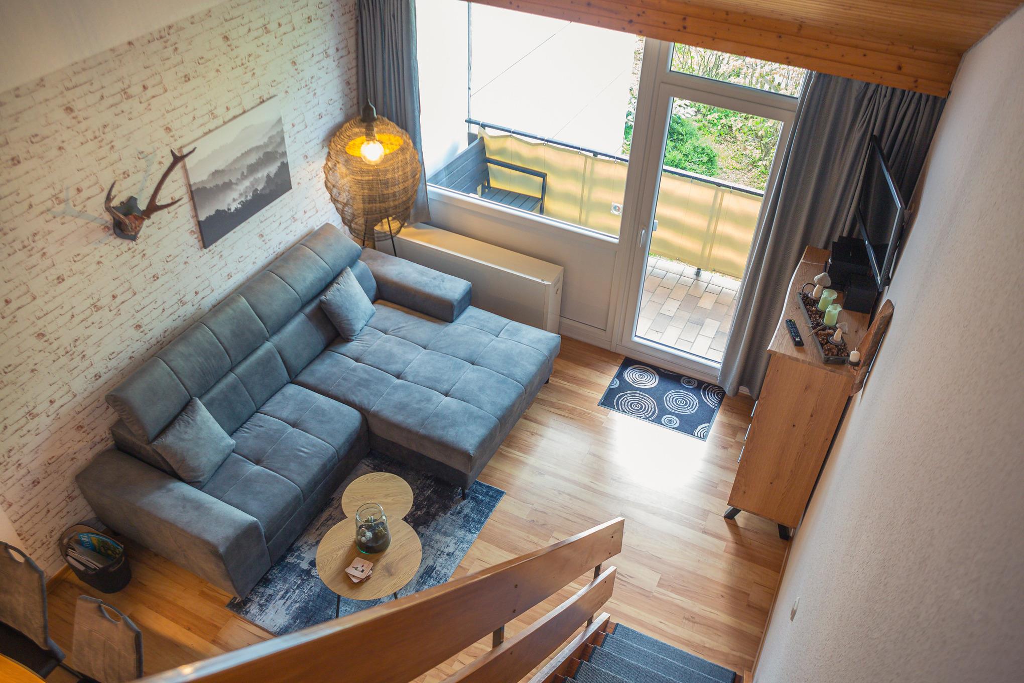 Auf Sie wartet eine gemütliche Ferienwohnung mit 1 Schlafzimmer mit Doppelbett und einem weiteren Boxspringbett auf der Galerie im Wohnbereich. Das Wohnzimmer bietet eine große gemütliche Eck-Couch sowie einem Essbereich mit Tisch und Stühlen. Vom Wohnzimmer aus gelangen Sie direkt auf den Balkon.