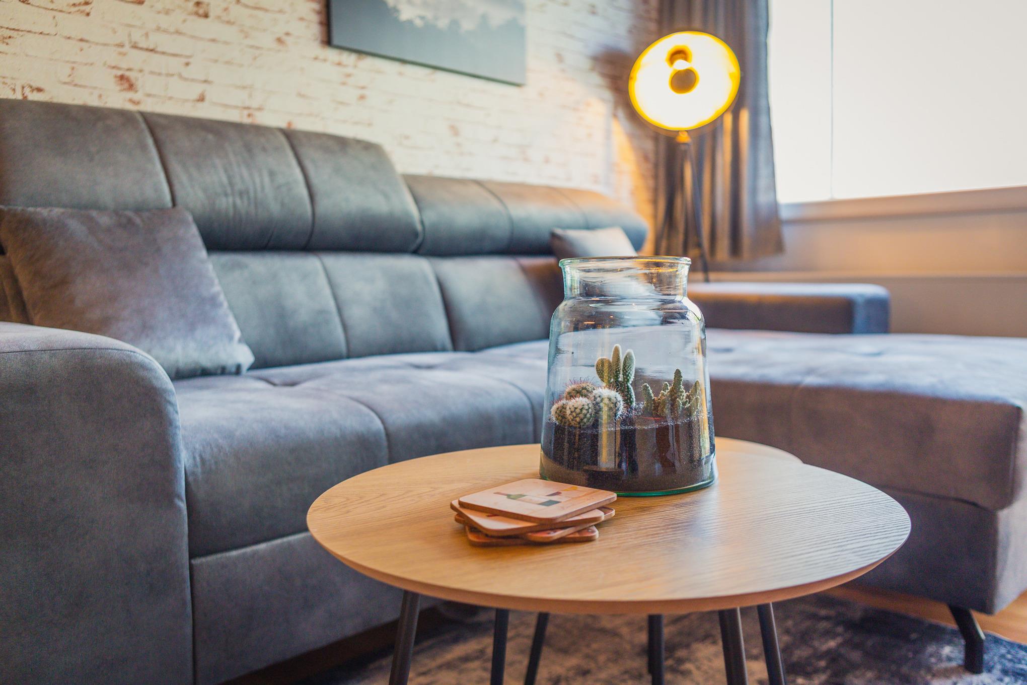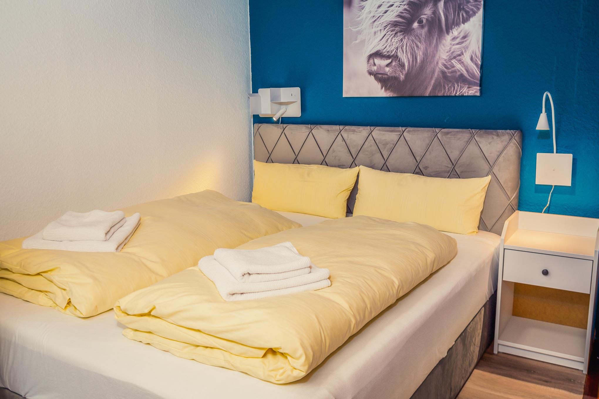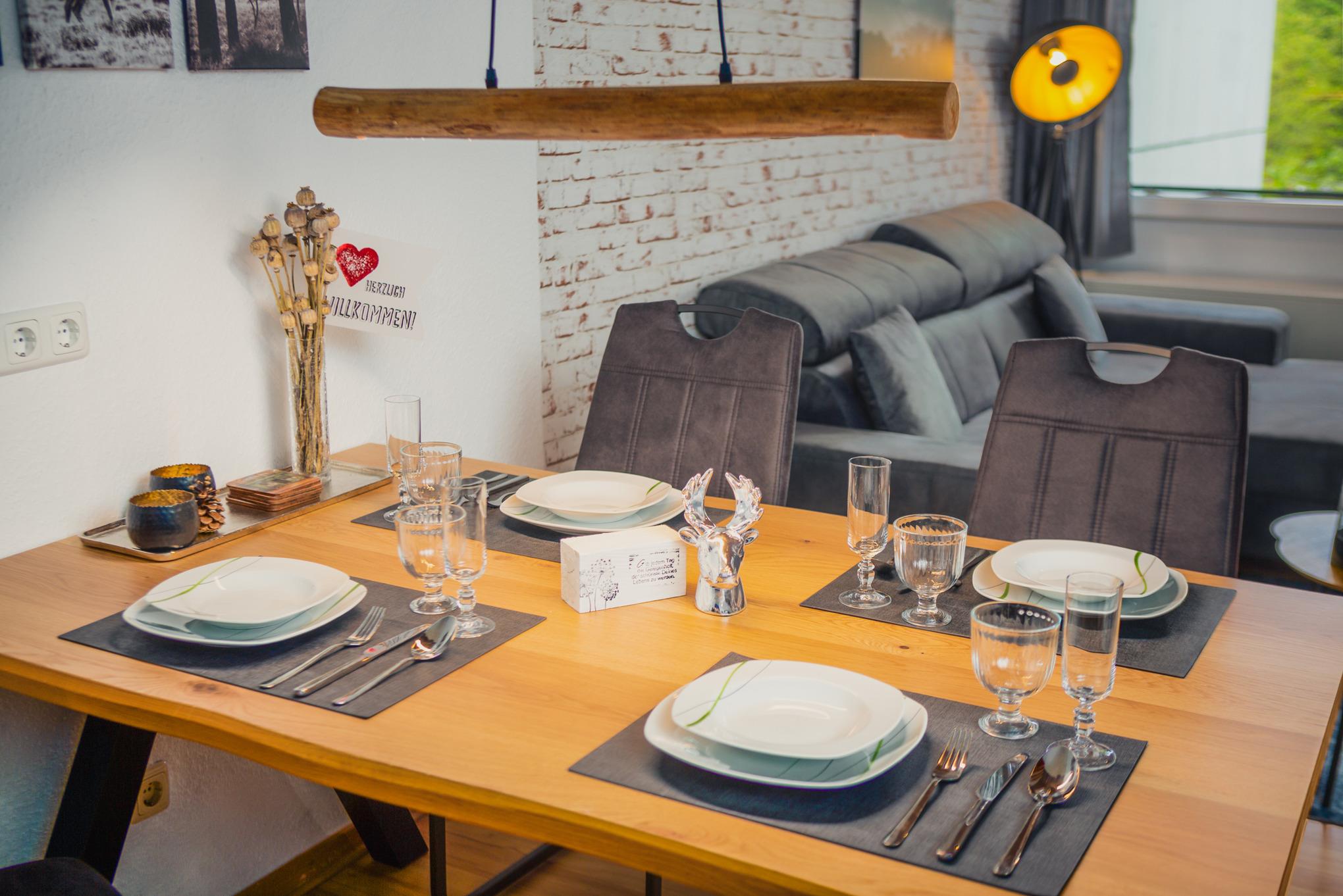 Auf Sie wartet eine gemütliche Ferienwohnung mit 1 Schlafzimmer mit Doppelbett und einem weiteren Boxspringbett auf der Galerie im Wohnbereich. Das Wohnzimmer bietet eine große gemütliche Eck-Couch sowie einem Essbereich mit Tisch und Stühlen. Vom Wohnzimmer aus gelangen Sie direkt auf den Balkon.