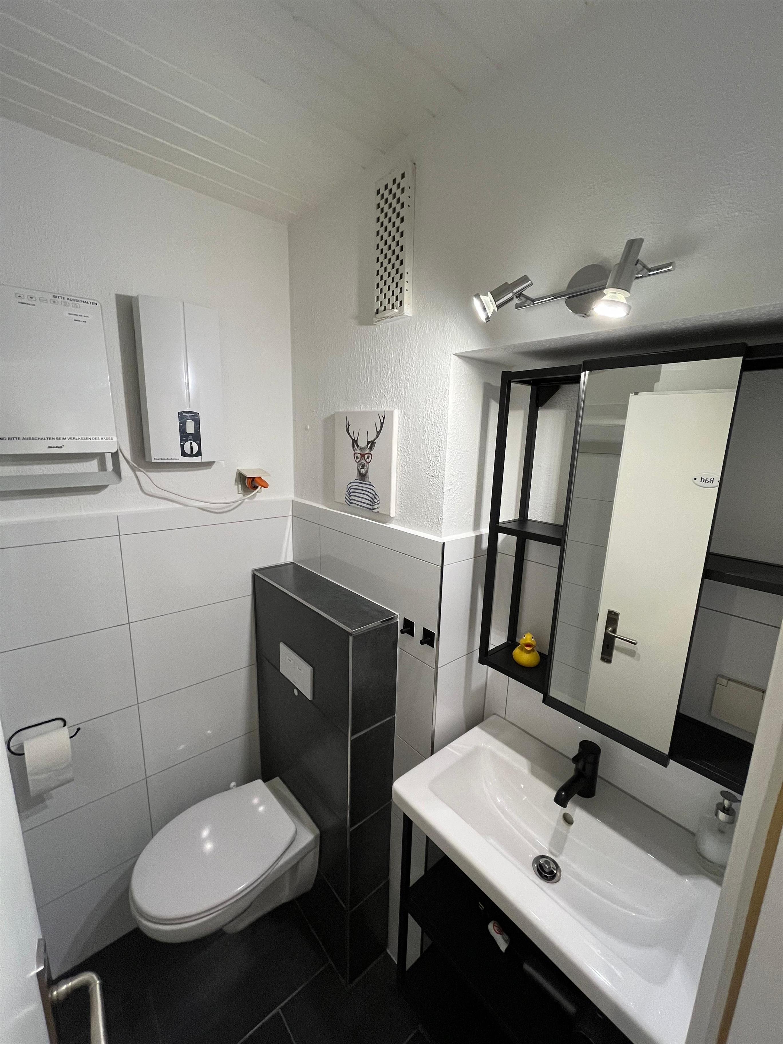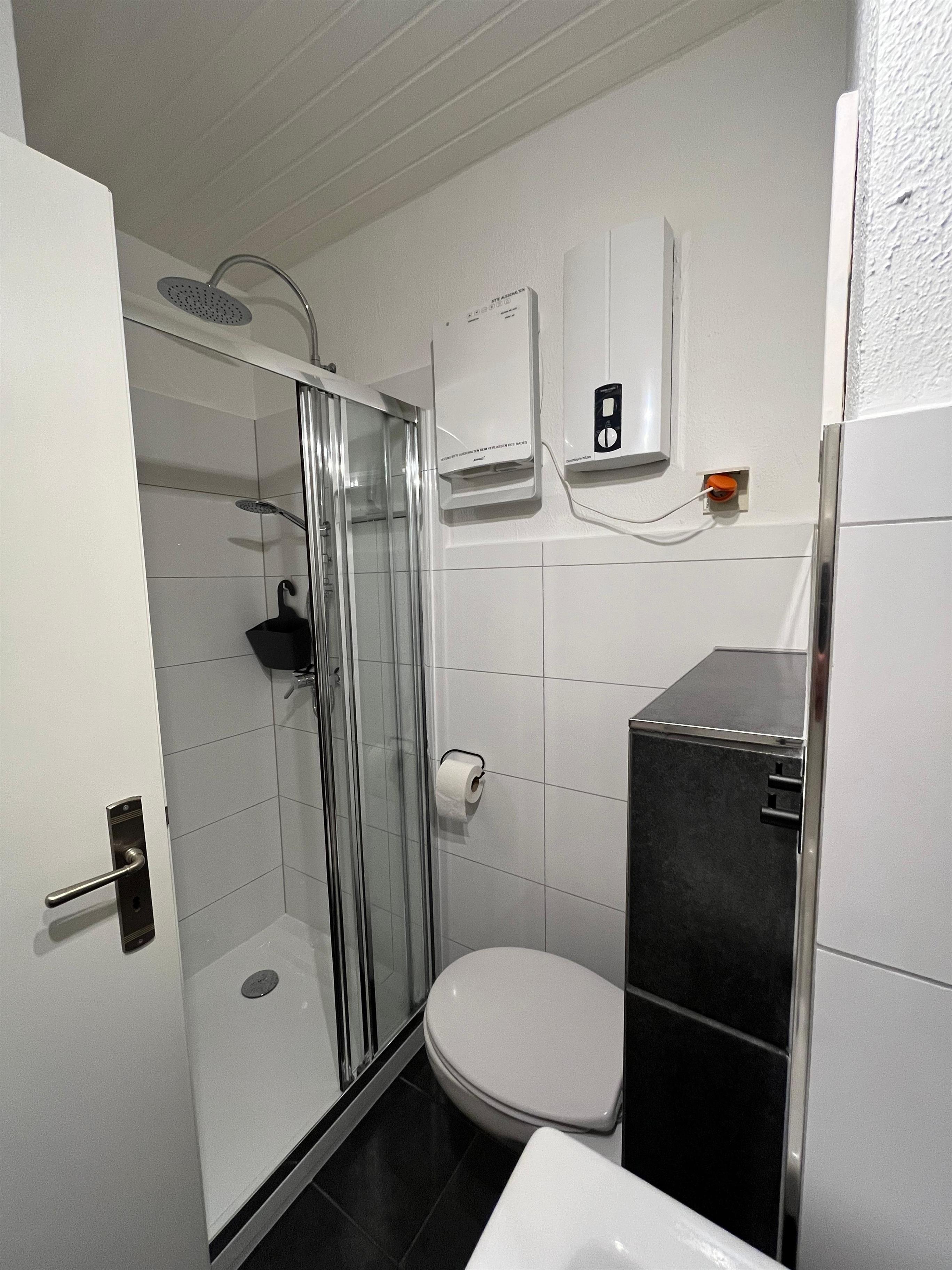 Das Badezimmer wurde im Juni 2024 saniert. Hierbei wurden die Wände neu gefliest und die Duschabtrennung erneuert. Es verfügt über eine Dusche, WC, Waschbecken, Spiegel, Handtuchhalter und Fön.