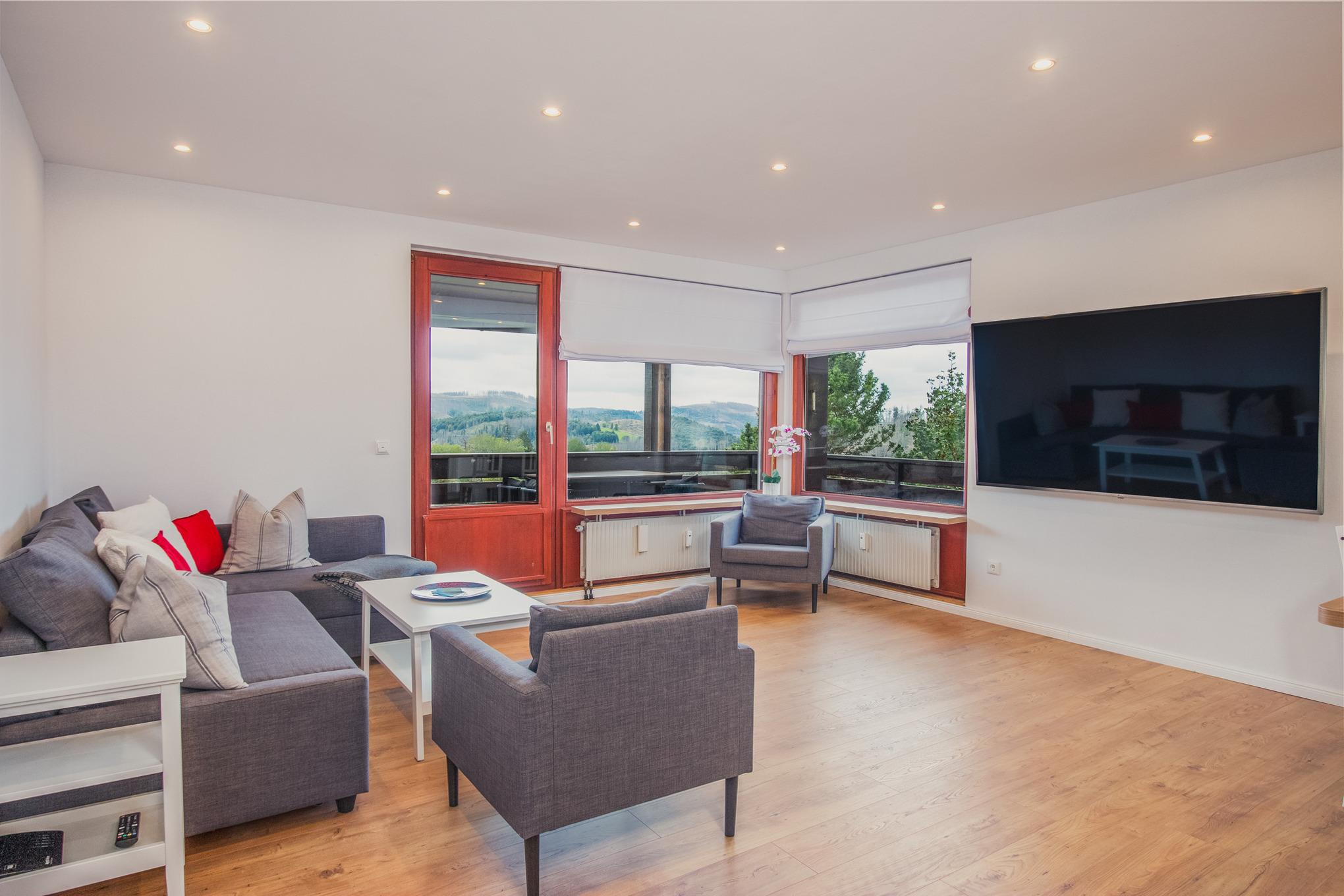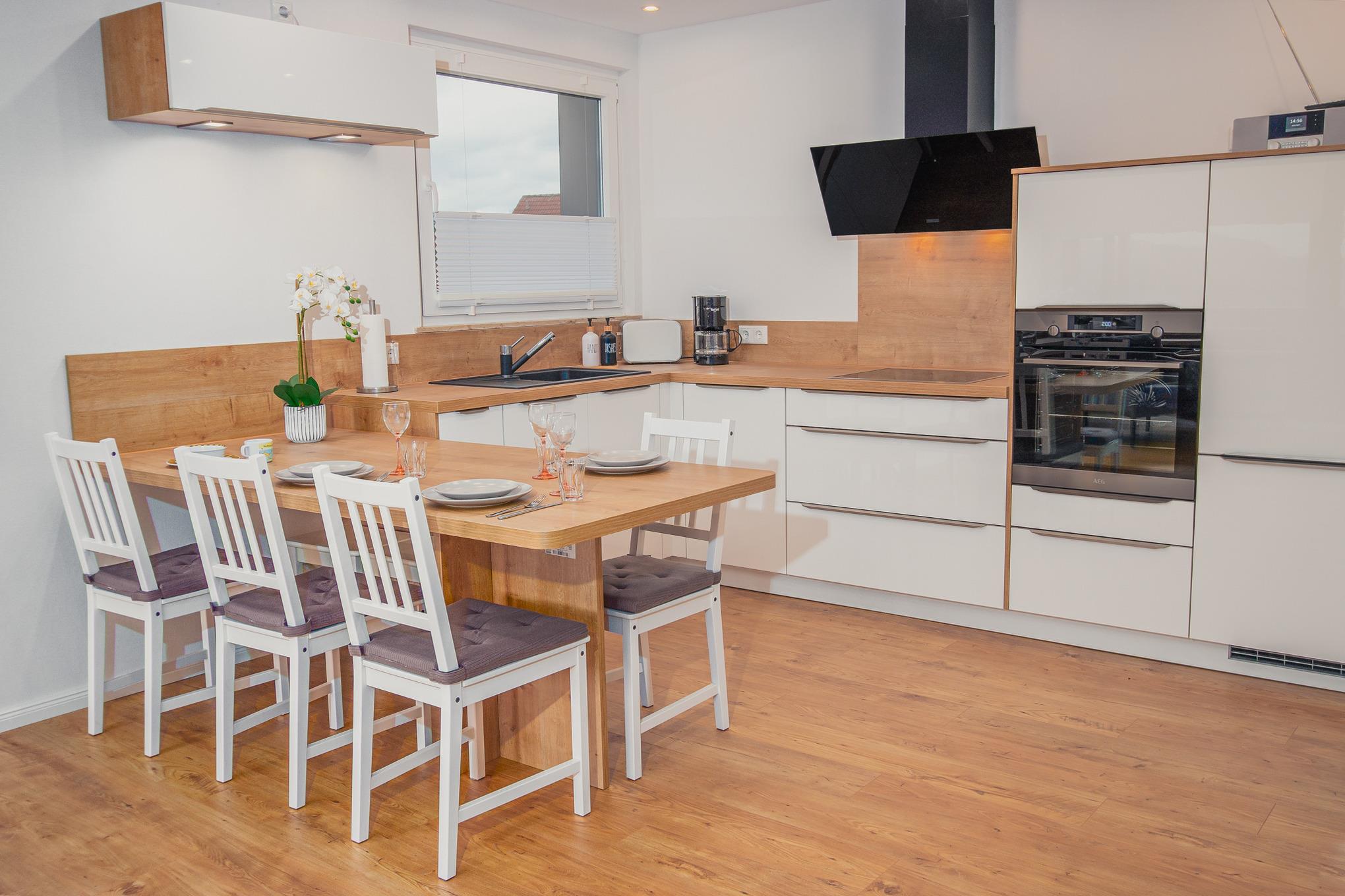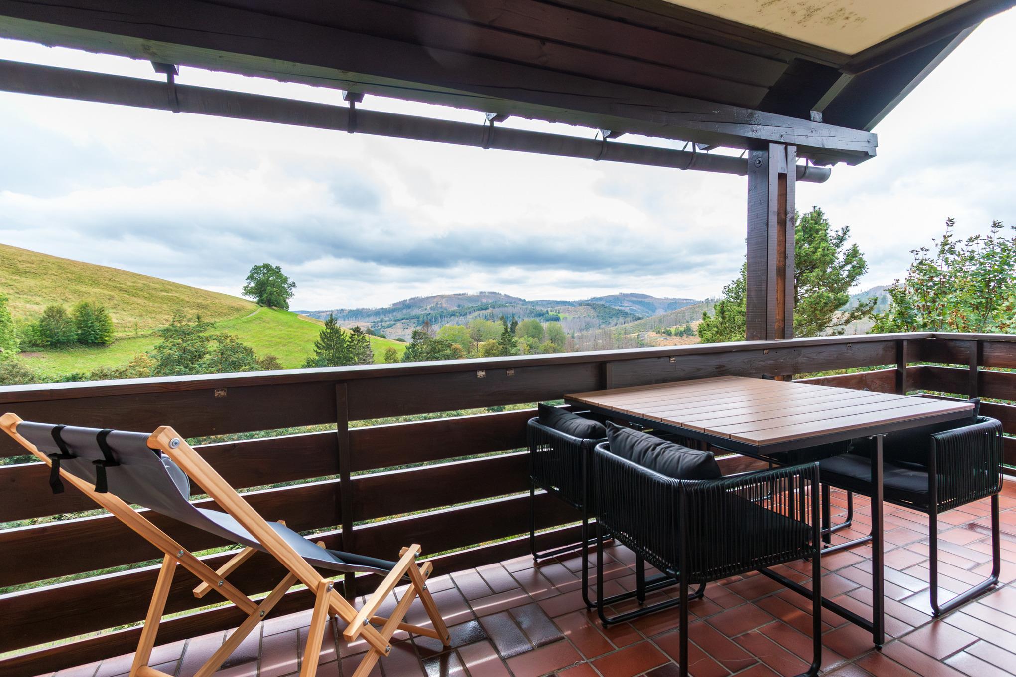 Neu sanierte, moderne Ferienwohnung mit 2 Schlafzimmern und ausreichend Platz für 4 Personen. Genießen sie den traumhaften Blick in den Harz vom großen über Eck verlaufenden Balkon.