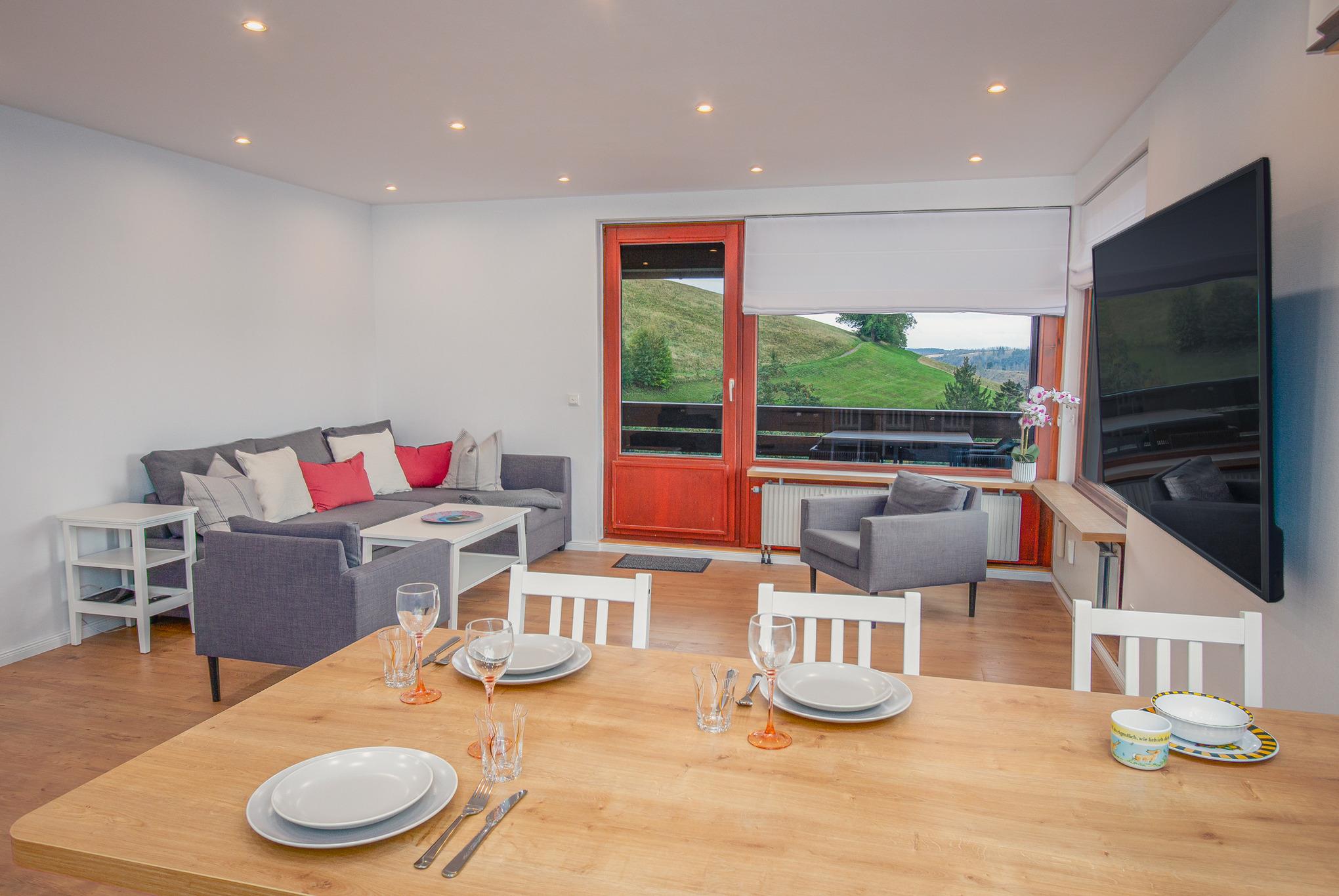 Der Wohnbereich ist gemütlich eingerichtet und bietet ausreichend Platz zum Entspannen. Ein Highlight ist der große Balkon, auf dem Sie die frische Luft genießen und den Ausblick auf die Umgebung bewundern können. Dies ist der perfekte Ort, um Ihr Frühstück zu genießen oder am Abend zu entspannen.
