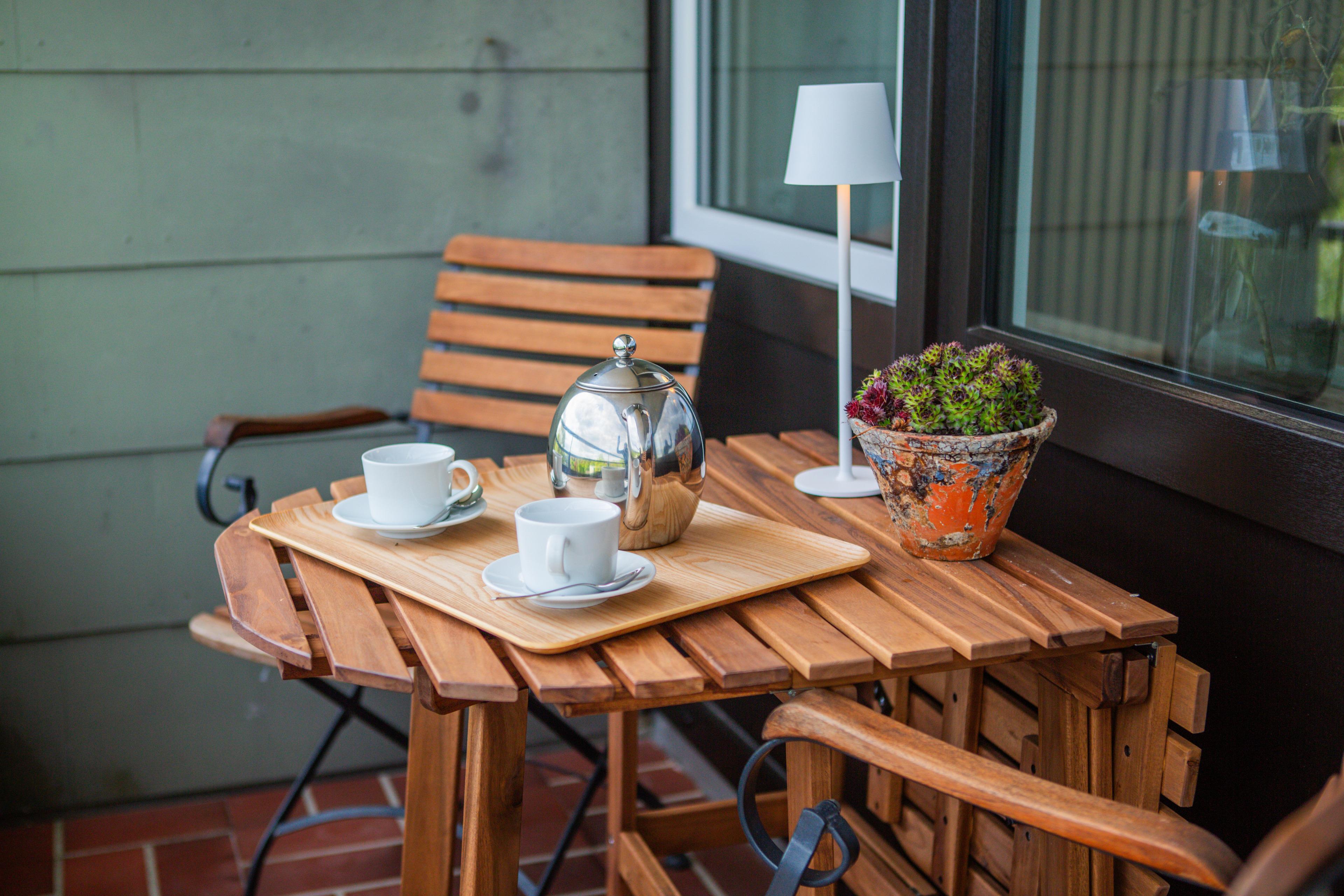 Genießen Sie entspannte Stunden auf dem großzügigen Balkon mit wunderschönem Blick ins Grüne – der ideale Ort zum relaxen auf der Sonnenliege oder ein Glas Wein am Abend.