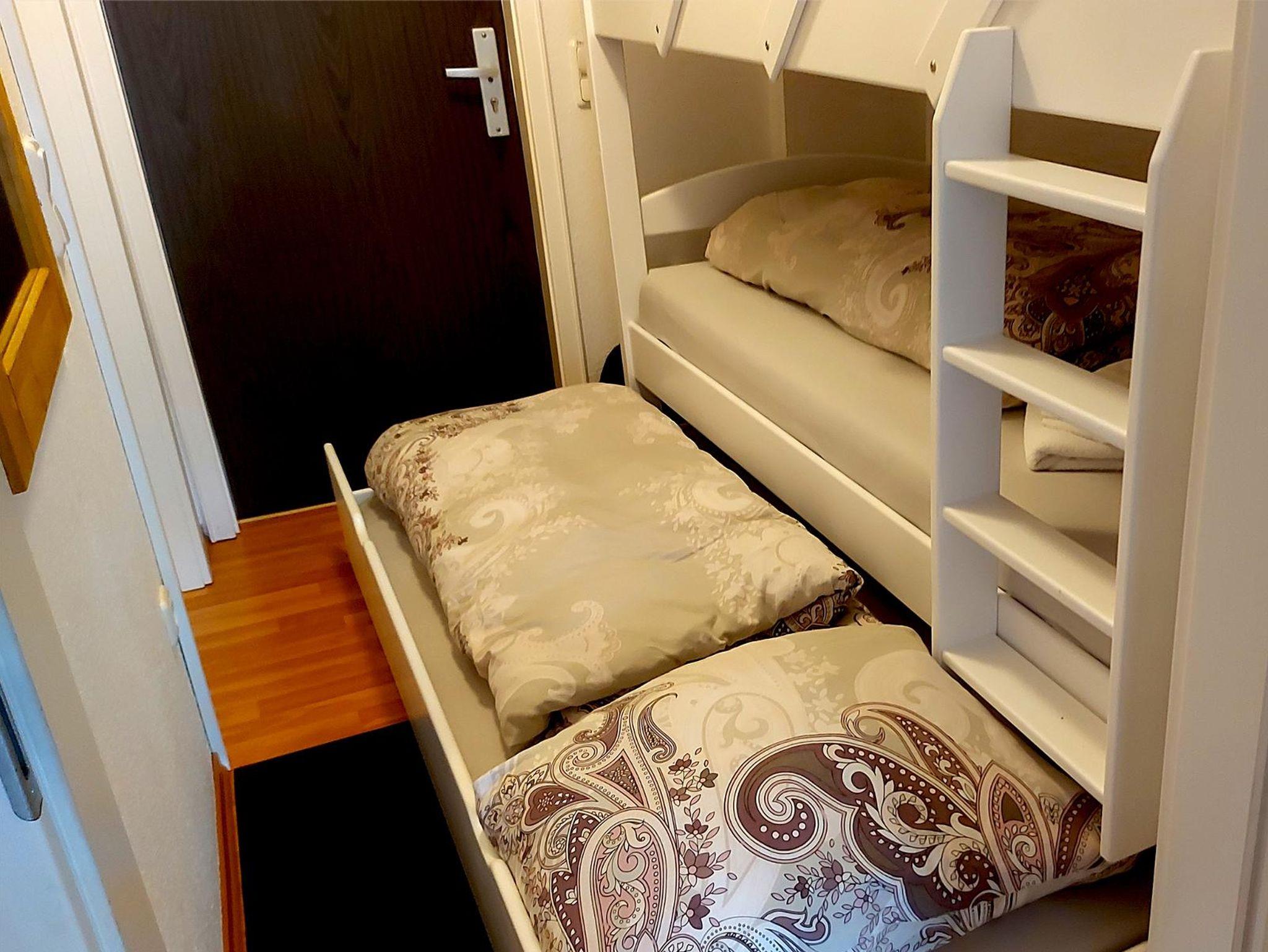 Im Schlafzimmer erwartet Sie ein großzügiges Boxspringbett (180 × 200 cm), das Ihnen erholsame Nächte und höchsten Schlafkomfort garantiert. Für weitere Übernachtungsgäste steht im Flur ein praktisches, ausziehbares Etagenbett zur Verfügung, das bequem Platz für bis zu drei Personen bietet.