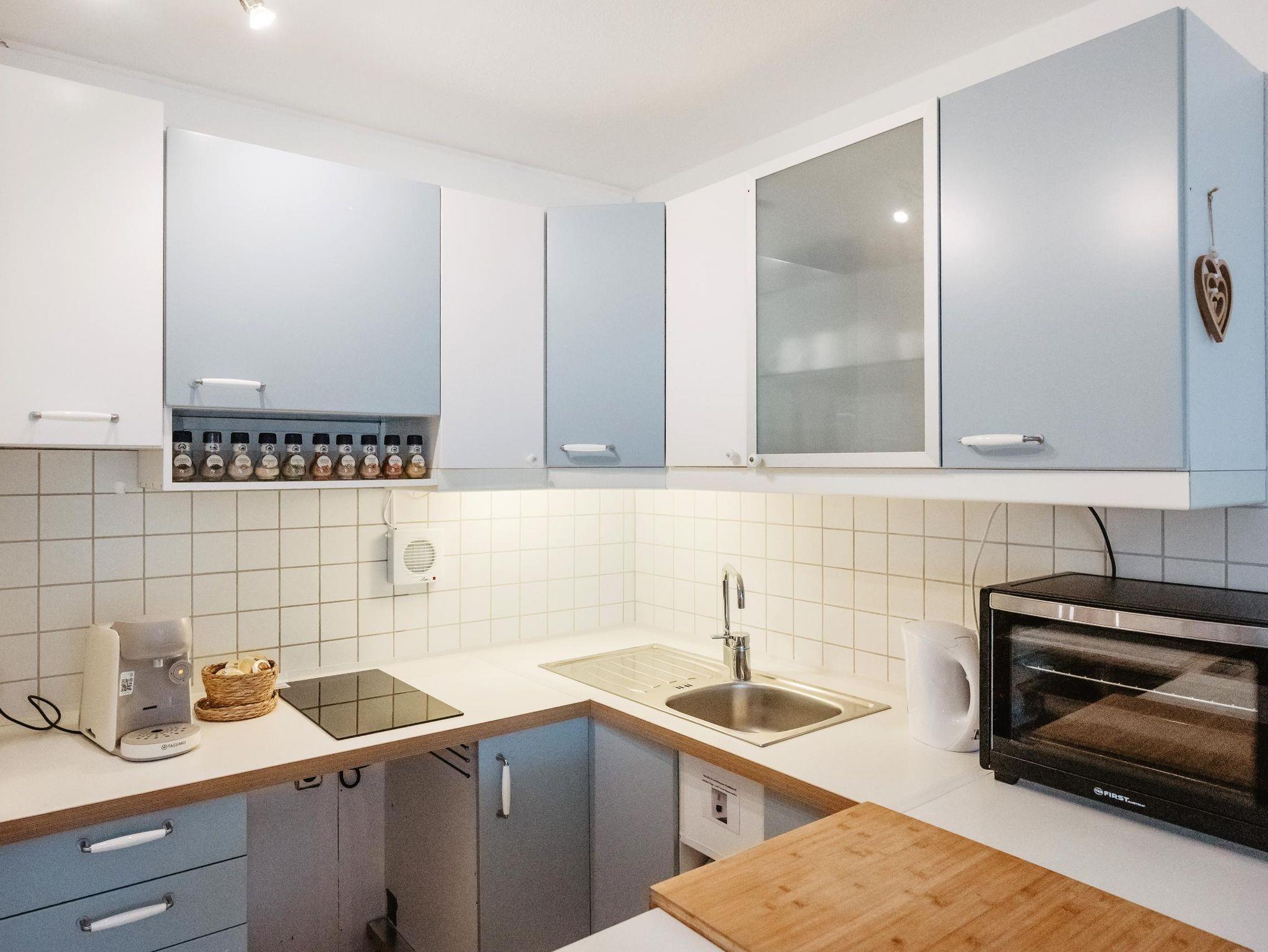 Die Küche ist voll ausgestattet mit Kaffeemaschine, Spülmaschine, Zwei-Platten-Herd und Backofen – so können Sie sich auch im Urlaub wie zuhause selbst versorgen. Hochwertige Handtücher und Bettwäsche sind inklusive, ebenso wie WLAN und ein Fernseher für entspannte Stunden. Viel Stauraum sorgt dafür, dass Sie sich auch bei längeren Aufenthalten rundum wohlfühlen können.