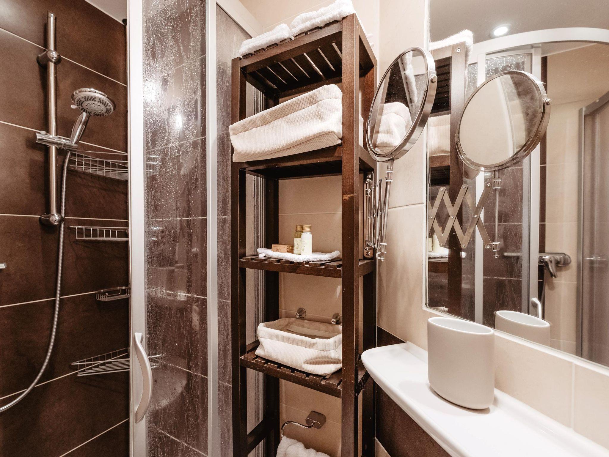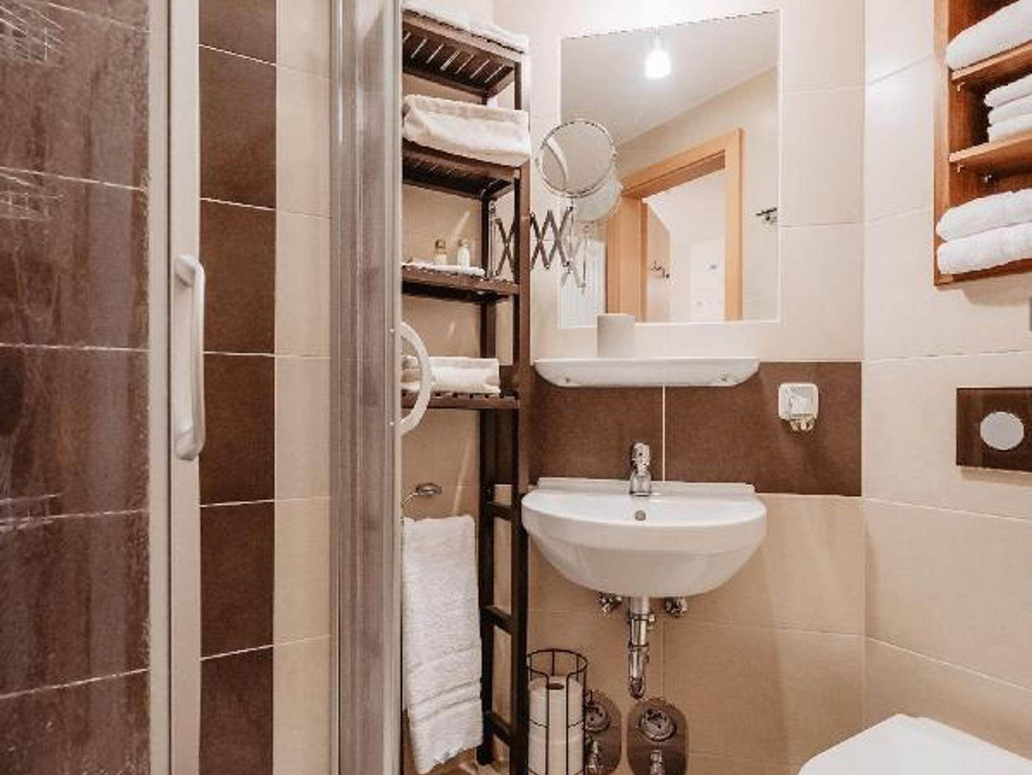Die Schlafmöglichkeiten sind praktisch und komfortabel gestaltet: Ein Etagenbett bietet zwei Schlafplätze – besonders beliebt bei Kindern – und eine gemütliche Schlafcouch bietet zusätzlich Platz für zwei Personen. Das moderne Bad verfügt über eine Dusche und ein WC.