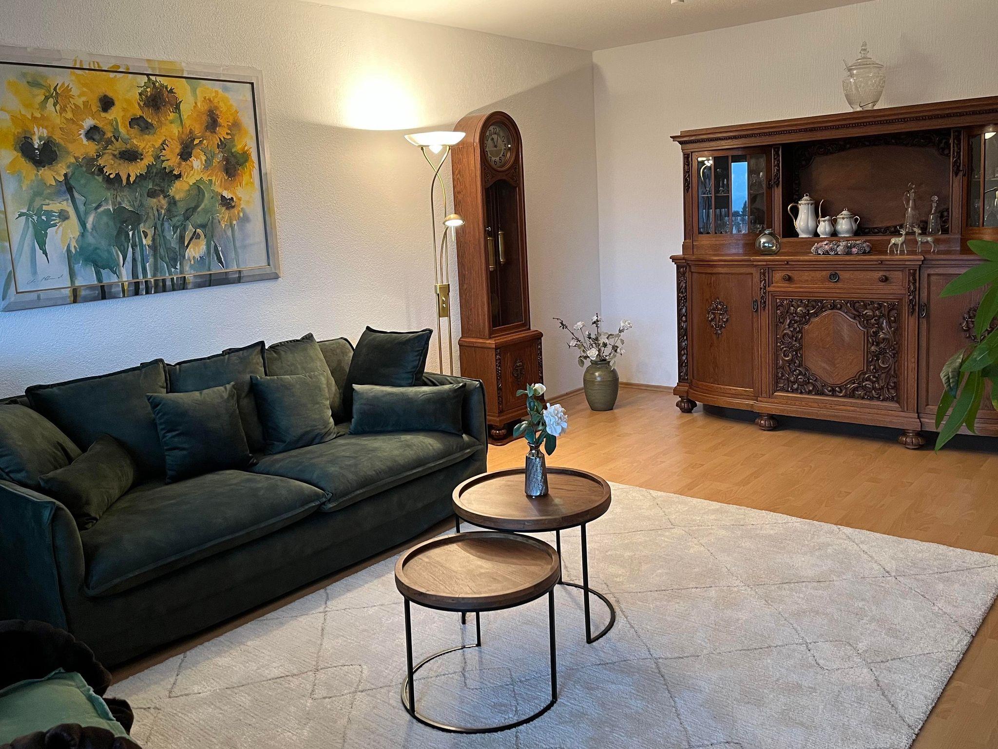 Die Wohnung ist 98 qm groß und befindet sich im Erdgeschoss unseres Wohnhauses. Es handelt sich um eine abgeschlosssene Wohnung, welche über ein Wohnzimmer, zwei Schlafzimmer die mit jeweils einem Doppelbett ausgestattet sind, eine Küche mit Esstisch ein Duschbad mit WC sowie eine separate Gästetoilette verfügt. Zum Entspannen und Frischluftgenießen lädt ein großer Balkon mit Liege und Sitzgruppe ein. Sie haben von hier einen schönen Blick in unseren grünen Garten.