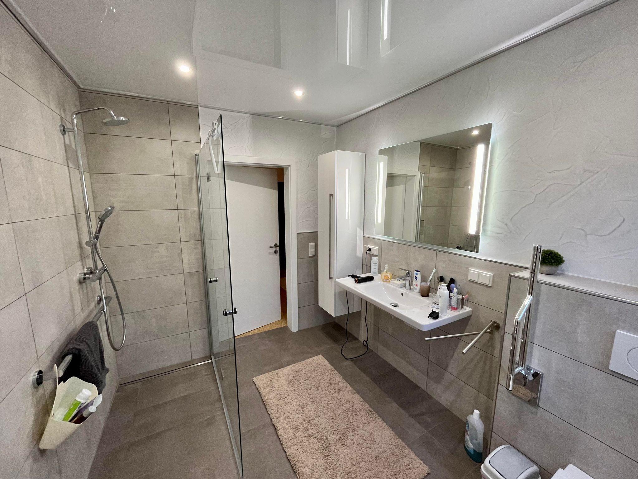 Die Ferienwohnung ist sehr geräumig. Ein breiter Flur erschließt die verschiedenen Räume. Die Küche ist mit allen wichtigen Utensilien sowie Geräten (Mikrowelle, Espressomaschine, Kaffeemaschine, Wasserkocher, Toaster, Eierkocher) ausgestattet. Eine Kühl- Gefrierkombination, ein Geschirrspüler als auch ein Umluftherd mit Kochceranfeld und beleuchtetem Dunstabzug sind vorhanden. Das Bad ist komplett neu und barrierearm eingerichtet. Der Duschbereich im Bad ist barrierefrei mit großer Haltestange. Das Bad verfügt über ein großes Fenster. Schönes, großes Wohnzimmer und Balkon mit Sitzgruppe.
