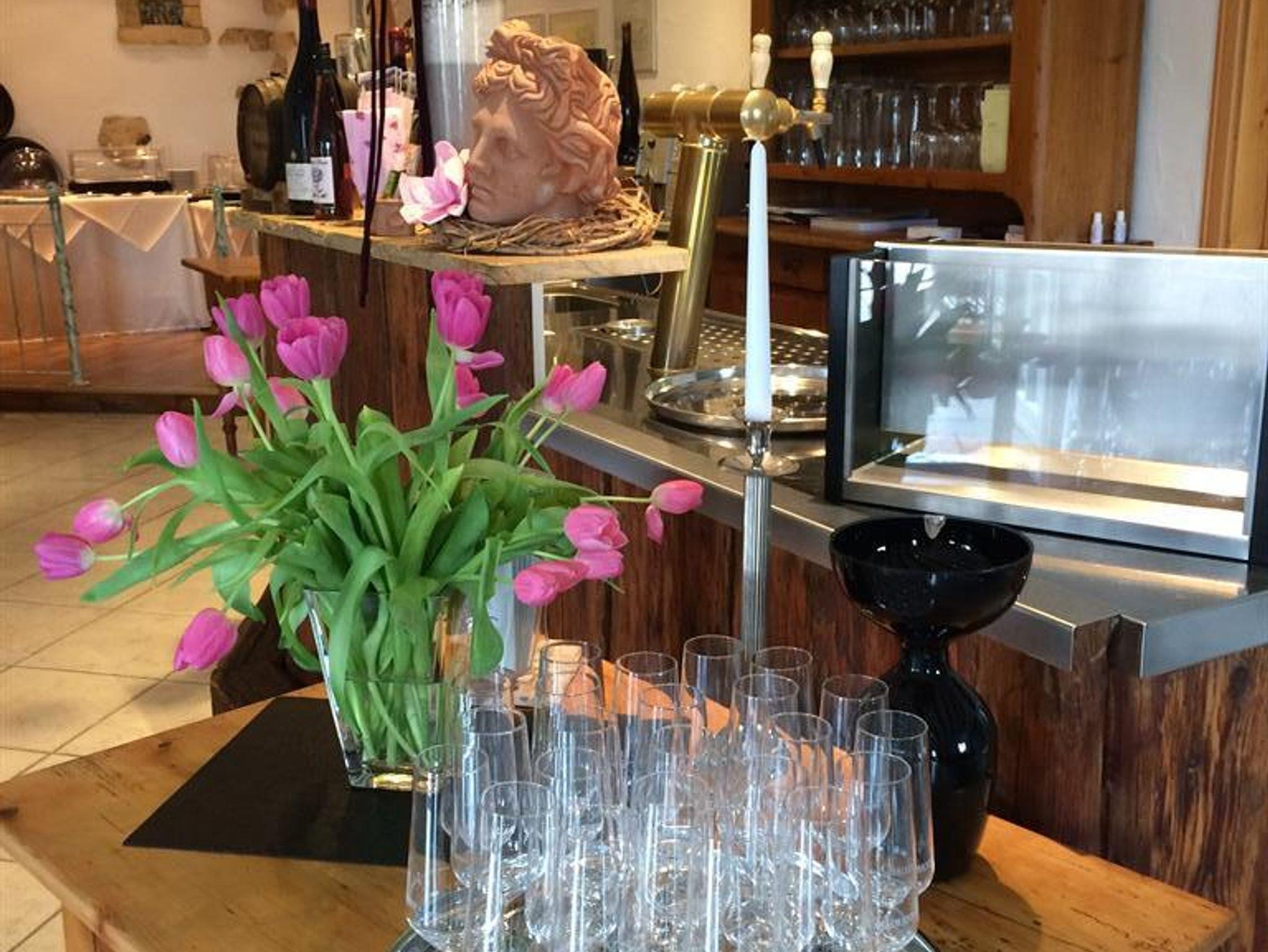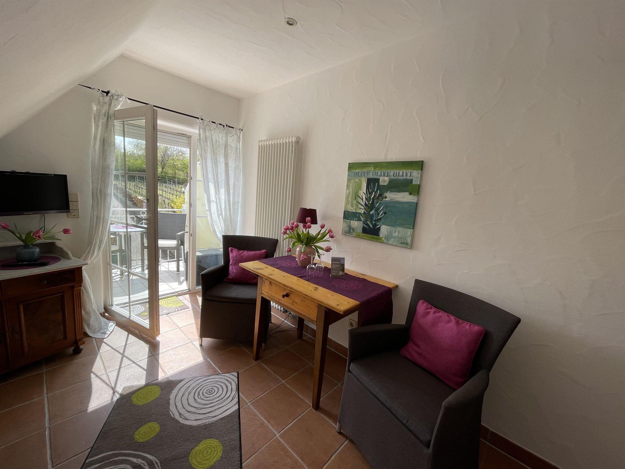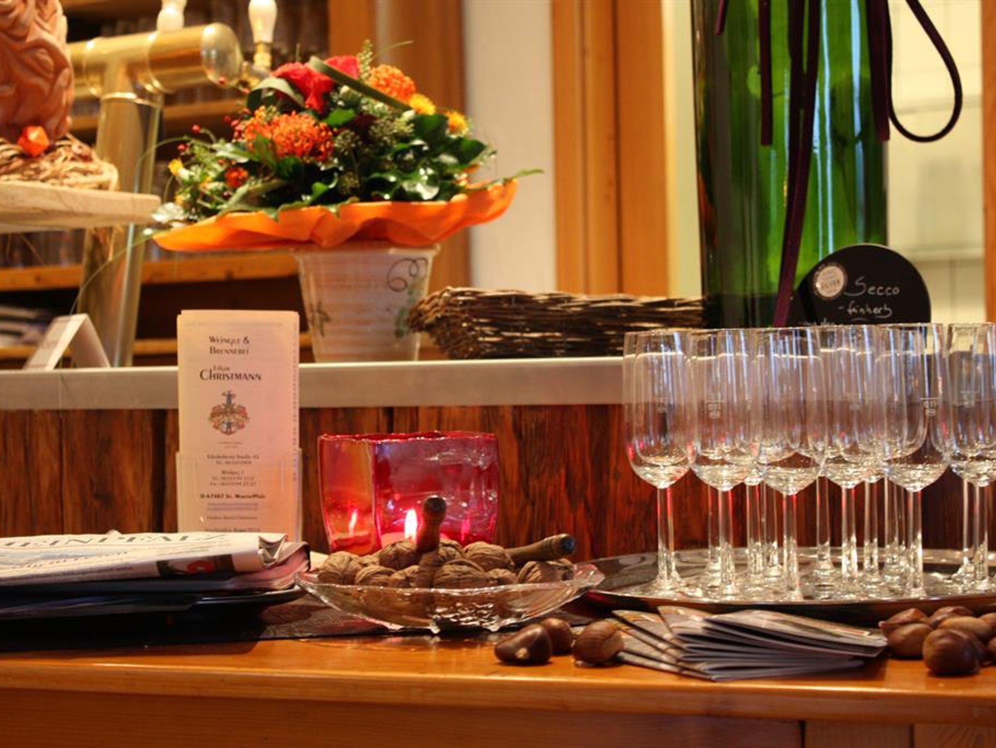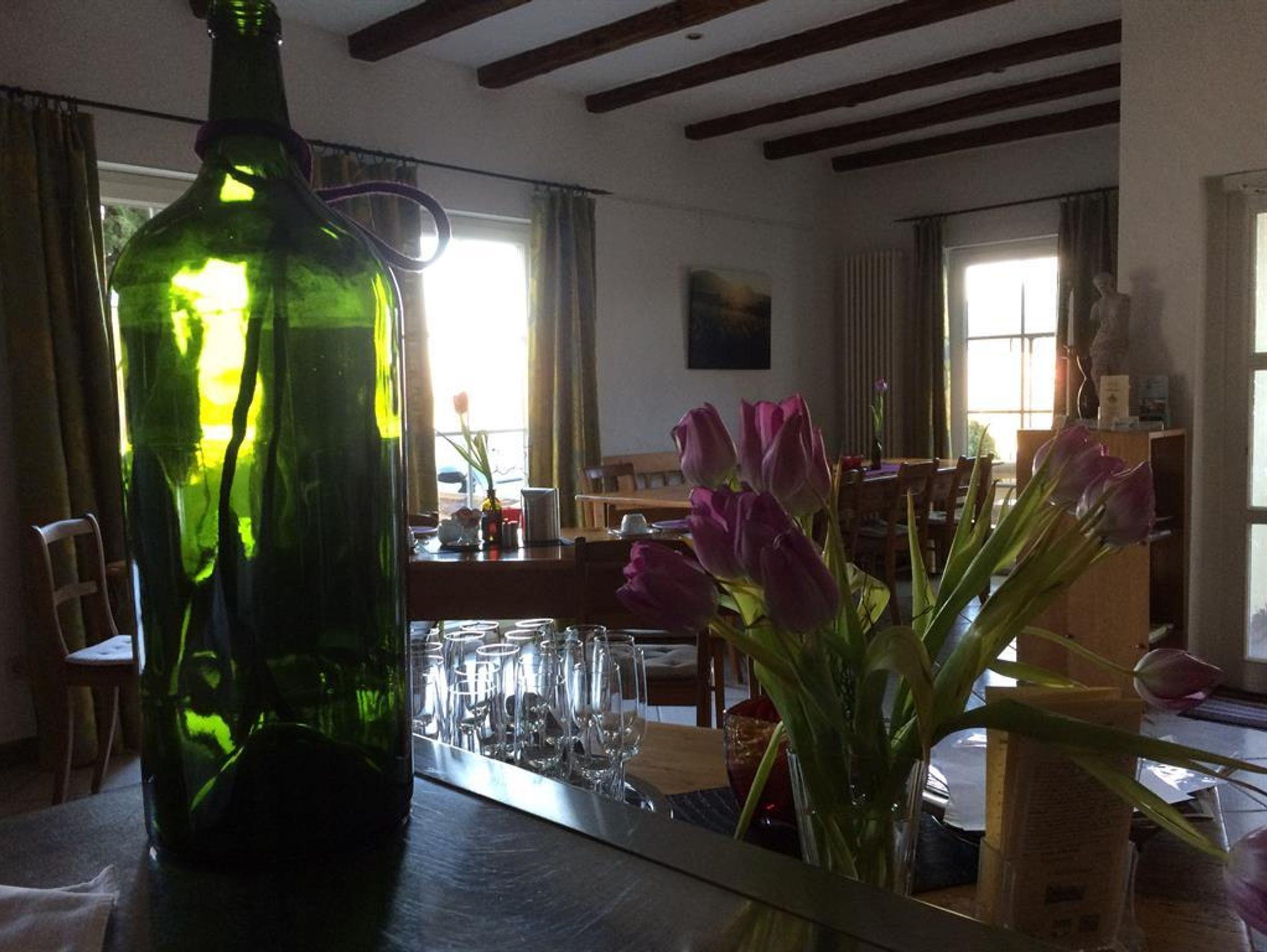 In unserem Aufenthaltsraum verfügen wir über Getränkekühlschränke. Sie haben damit die Gelegenheit unsere gepflegten Weine, Brände, Sekt und Secco, die alle aus eigenen Erzeugnissen stammen, zu genießen. Hier befindet sich außerdem auch ein Gemeinschaftsbalkon. Zur Weinprobe steht das kleine Weinprobierstübchen täglich – nach Absprache, innerhalb der Öffnungszeiten - zur Verfügung. Kostenloses Parken ist direkt am Haus auf unserem Parkplatz möglich. Für Fahrräder (auch E-Bikes) haben wir eine Unterstellmöglichkeit in unserer mit Code abschließbaren Fahrradgarage, natürlich auch kostenfrei. Auch im Außenbereich verfügen wir über Sitzgelegenheiten; unter unseren Pavillons auch überdacht.