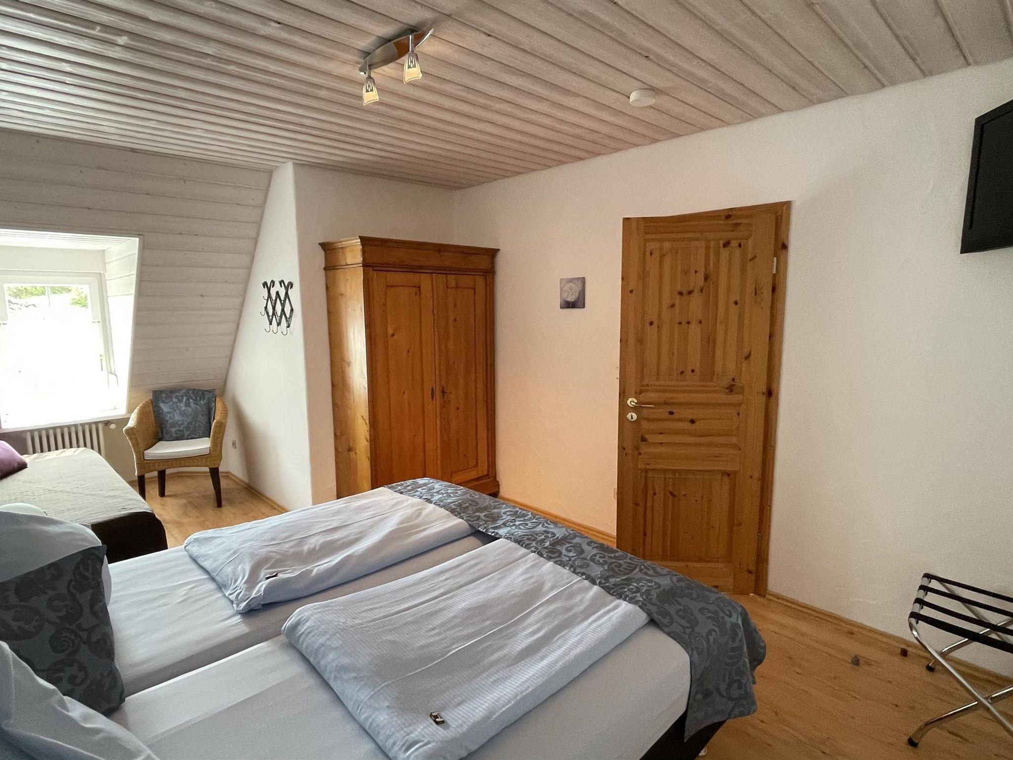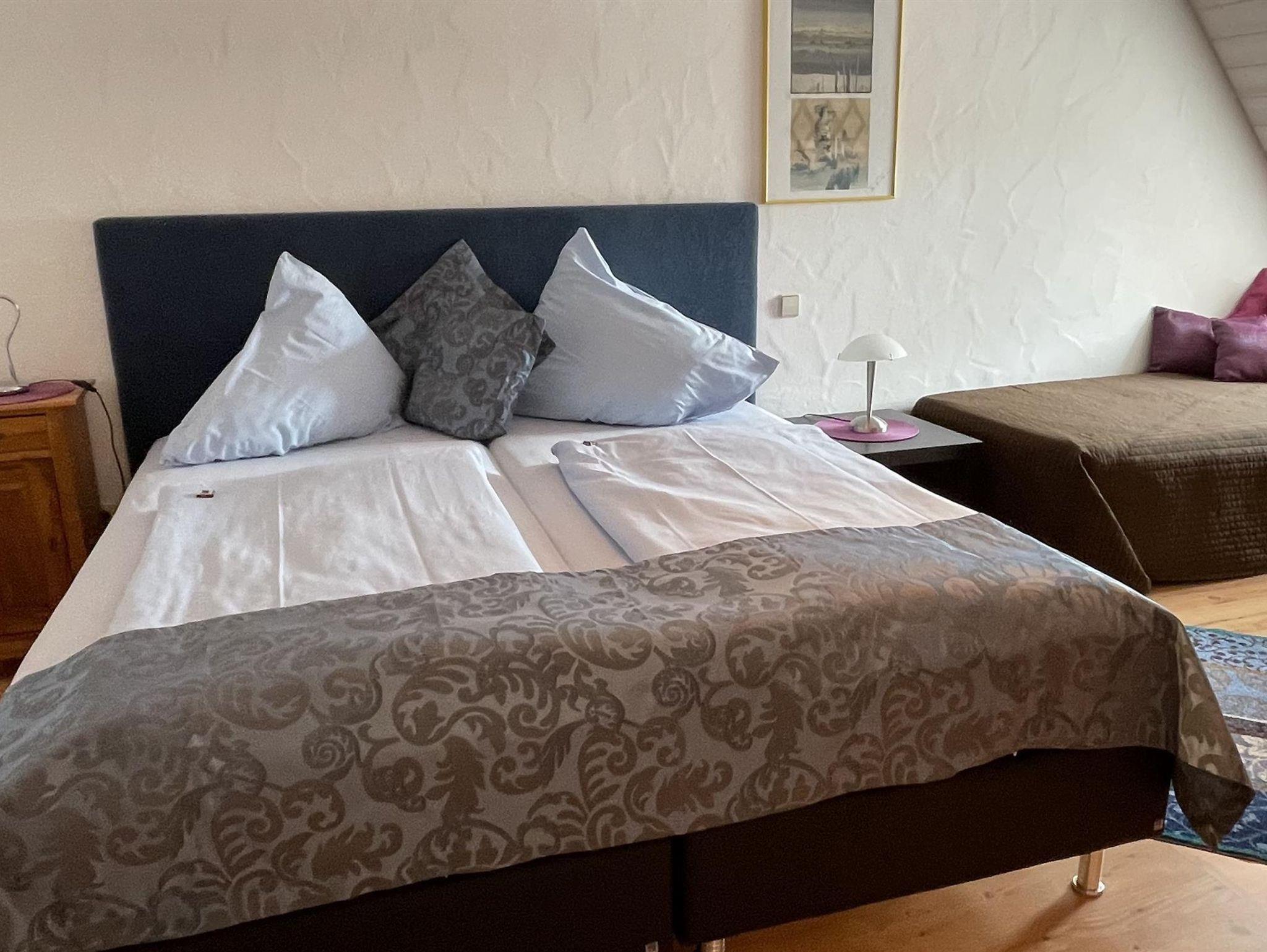 Appartement 2 verfügt über Dusch-Wannen-Kombi/WC, Föhn, Vergrößerungsspiegel, Badezimmerhocker und Handtuchwärmer; einem kleinen Essplatz mit Kochmöglichkeit (mit Ausstattung). Hier befindet sich ein 2. kleiner Flachbildschirm-SAT-TV mit integriertem Radio sowie möbliertem Balkon; 1 sep. Schlafzimmer mit 3. Bett, Kofferablage, Safe, möbliertem Balkon und Flachbildschirm-SAT-TV mit integriertem Radio. Die Boxspringbetten in Komforthöhe sind am Kopfteil höhenverstellbar und am Fußende offen. Es kostet 120,00 Euro per Nacht für 2 Personen inclusive Endreinigung. Appartement 2 befindet sich in der oberen Etage, mit Südbalkon in den Garten. Über einen Aufzug verfügen wir leider nicht. Handtücher, Bettwäsche etc. sind im Preis enthalten. Hinzu kommt lediglich noch die Kurtaxe, z.Zt. 1,00 Euro pro Person und Tag. Alle Appartements sind selbstverständlich auch mit unserem Frühstücksbuffet zu buchen. Pro Frühstück berechnen wir 15,00 Euro. Täglicher Zimmerreinigungsdienst bieten wir ebenfalls an. Pro Putzgang berechnen wir 15,00 Euro. Ob Sie diese beiden Serviceangebote nutzen möchten, können Sie natürlich auch noch vor Ort entscheiden.