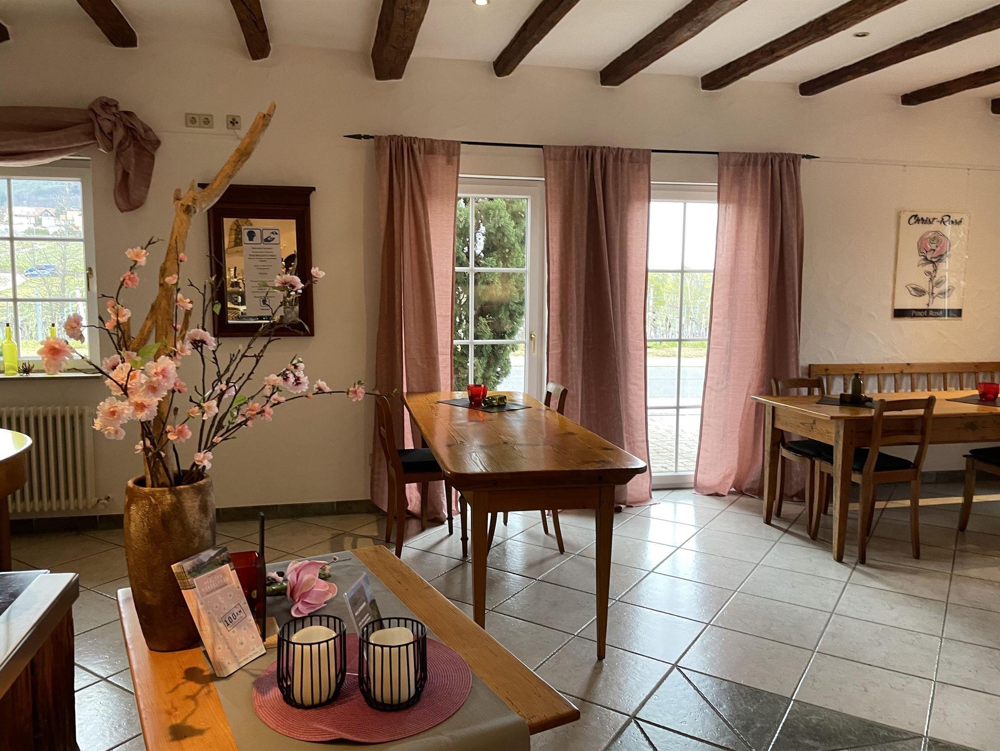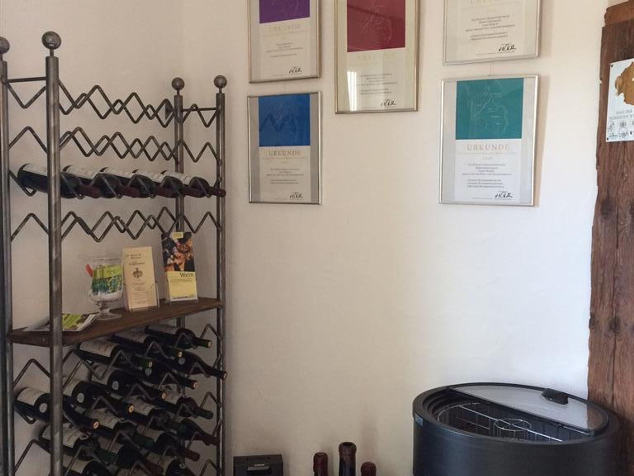 In unserem Aufenthaltsraum verfügen wir über Getränkekühlschränke. Sie haben damit die Gelegenheit unsere gepflegten Weine, Brände, Sekt und Secco, die alle aus eigenen Erzeugnissen stammen, zu genießen. Hier befindet sich außerdem auch ein Gemeinschaftsbalkon. Zur Weinprobe steht das kleine Weinprobierstübchen täglich – nach Absprache, innerhalb der Öffnungszeiten - zur Verfügung. Kostenloses Parken ist direkt am Haus auf unserem Parkplatz möglich. Für Fahrräder (auch E-Bikes) haben wir eine Unterstellmöglichkeit in unserer mit Code abschließbaren Fahrradgarage, natürlich auch kostenfrei. Auch im Außenbereich verfügen wir über Sitzgelegenheiten; unter unseren Pavillons auch überdacht.