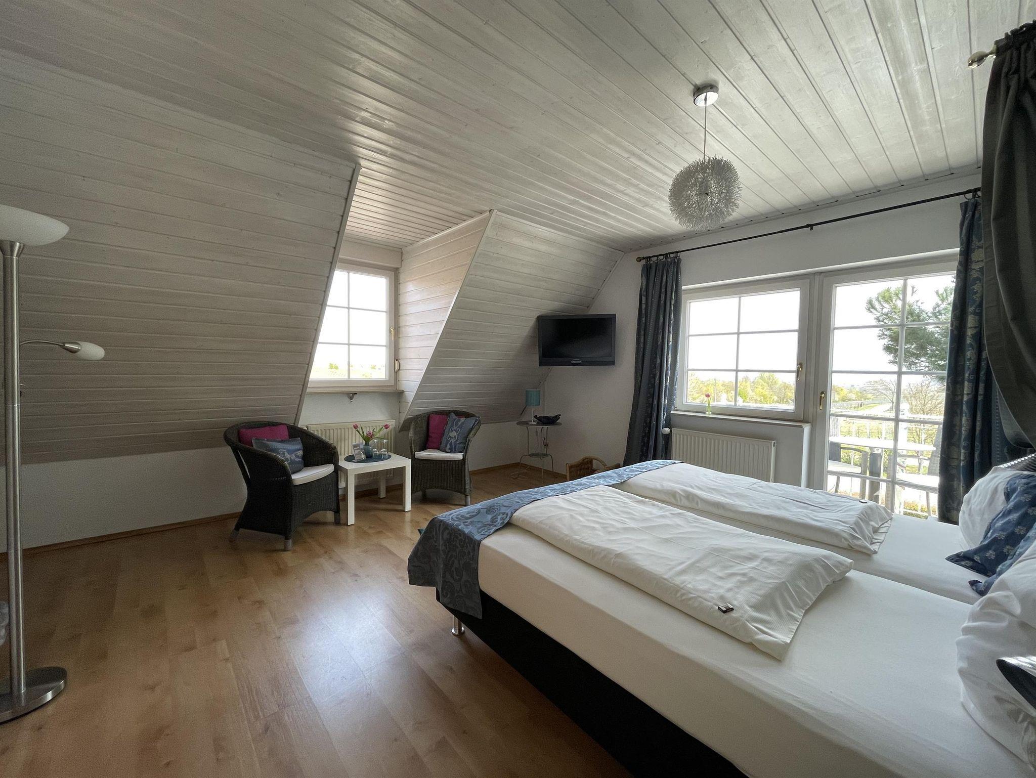 Appartement 1 verfügt über Dusche/WC, Föhn, Vergrößerungsspiegel, Badezimmerhocker, einem kleinen Essplatz mit Kochmöglichkeit (mit Ausstattung), 1 Wohn-Schlafzimmer mit kleiner Sitzecke mit Blick zum Hambacher Schloss und in die Rheinebene. Begehbarem Schrank, Kofferablage, Safe, möbliertem Ostbalkon und Flachbildschirm-SAT-TV mit integriertem Radio. Die Boxspringbetten in Komforthöhe sind am Fußende offen. Appartement 1 kostet 115,00 Euro per Nacht für 2 Personen incl. Endreinigung. Es befindet sich in der mittleren Etage mit Blick zum Hambacher Schloss und in die Rheinebene. Über einen Aufzug verfügen wir leider nicht. Handtücher, Bettwäsche etc. sind im Preis enthalten. Hinzu kommt lediglich noch die Kurtaxe, z.Zt. 1,00 Euro pro Person und Tag. Alle Appartements sind selbstverständlich auch mit unserem Frühstücksbuffet zu buchen. Pro Frühstück berechnen wir 15,00 Euro. Täglicher Zimmerreinigungsdienst bieten wir ebenfalls an. Pro Putzgang berechnen wir 15,00 Euro. Ob Sie diese beiden Serviceangebote nutzen möchten, können Sie natürlich auch noch vor Ort entscheiden.