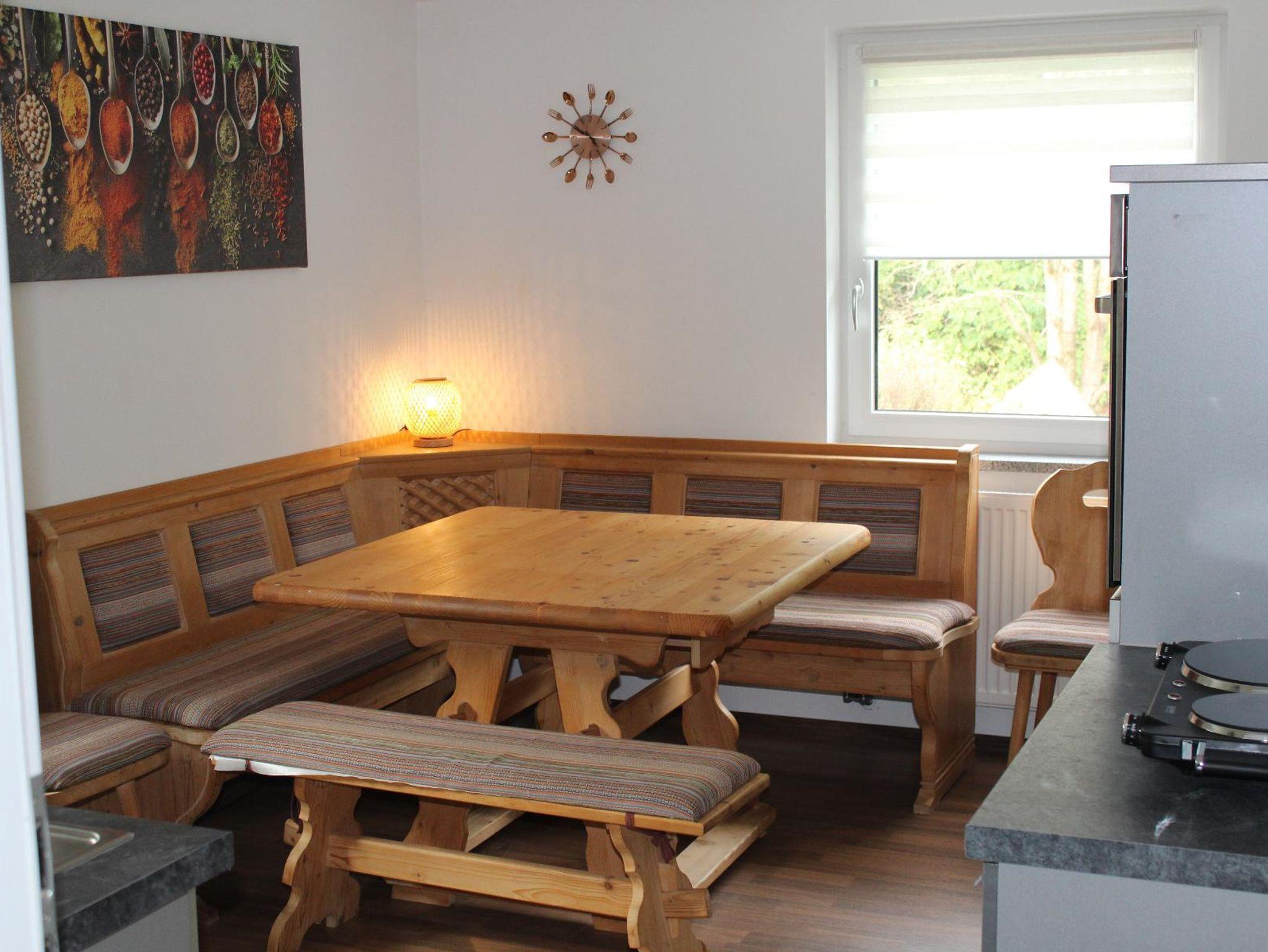 Die komplett eingerichtete Ferienwohnung zur Selbstverpflegung ist mit einer Küche mit Herd, Backofen, Geschirrspüler und einem gemütlichem Essbereich ausgestattet. Die Unterkunft verfügt über ein Schlafzimmer mit Doppelbett sowie ein weiteres Schlafzimmer mit einem Etagenbett, das Platz bietet für zwei kleinere Kinder (Bettlänge 1,70m).