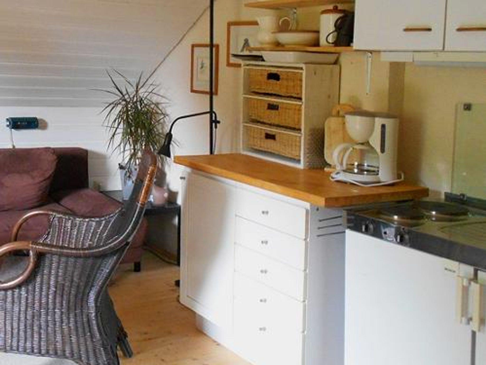 zwei Korbsesseln. Küchenblock mit Herd (zwei Platten), Kühlschrank,
