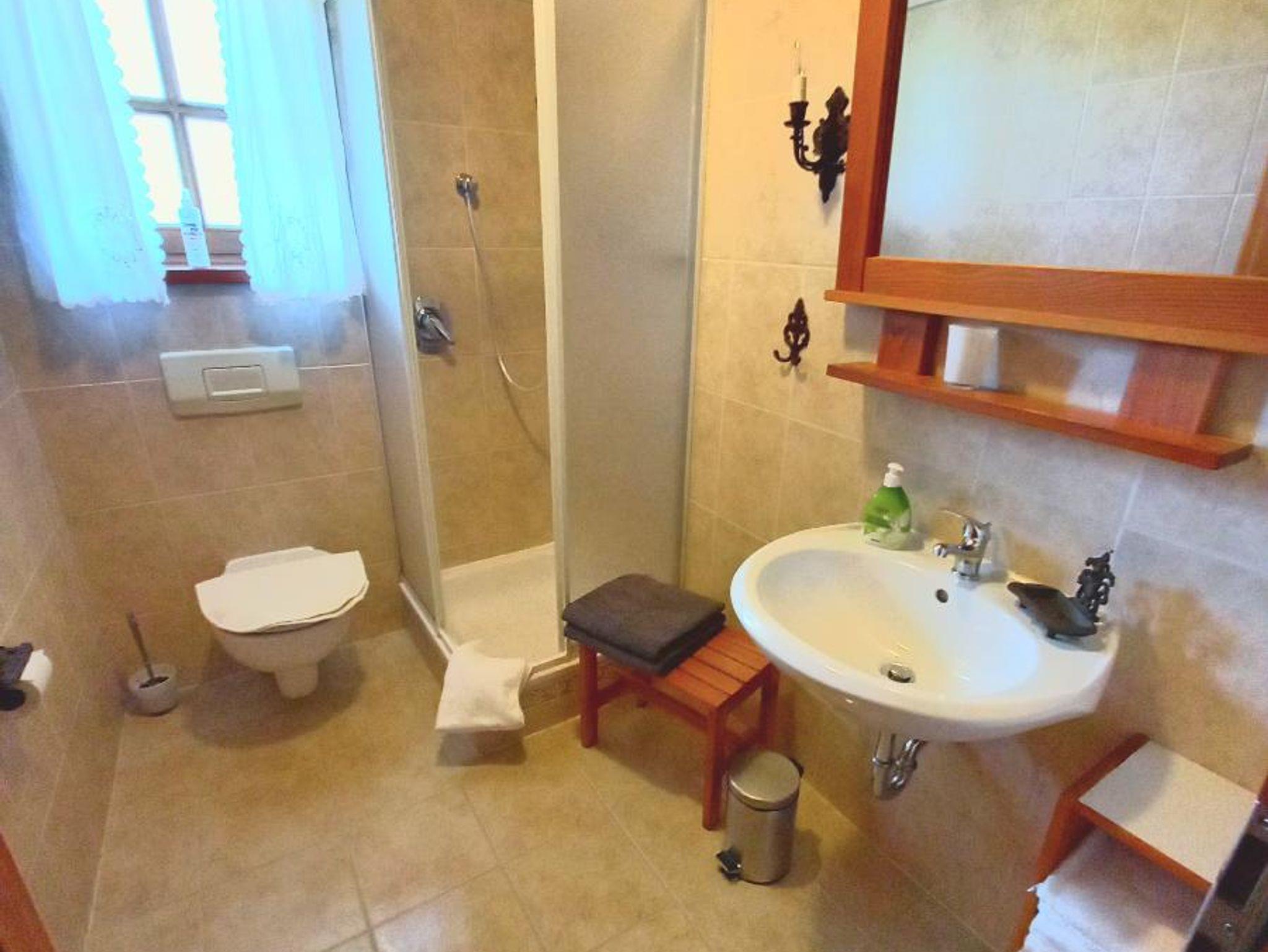 Schlafzimmer mit Doppelbett. Das Bad verfügt über eine Dusche, ein WC