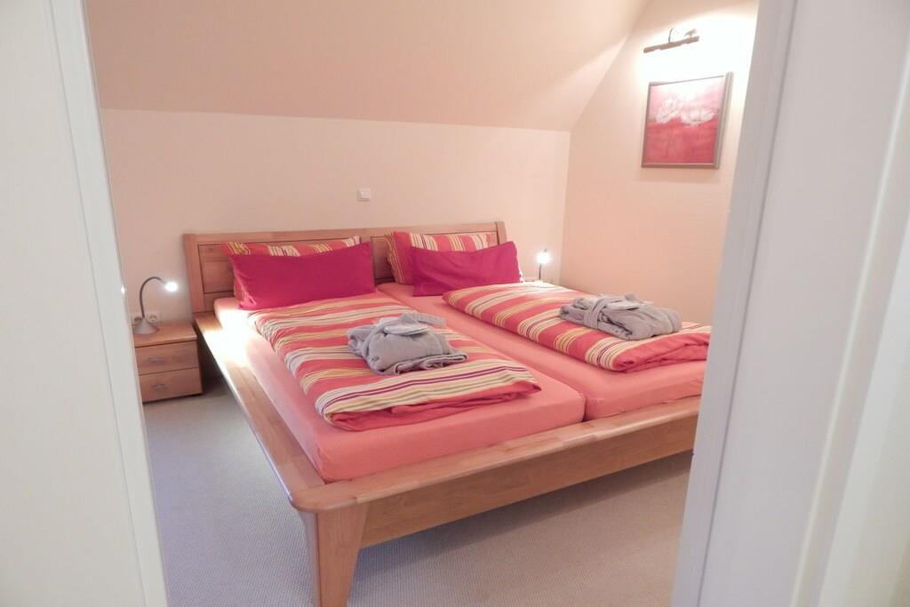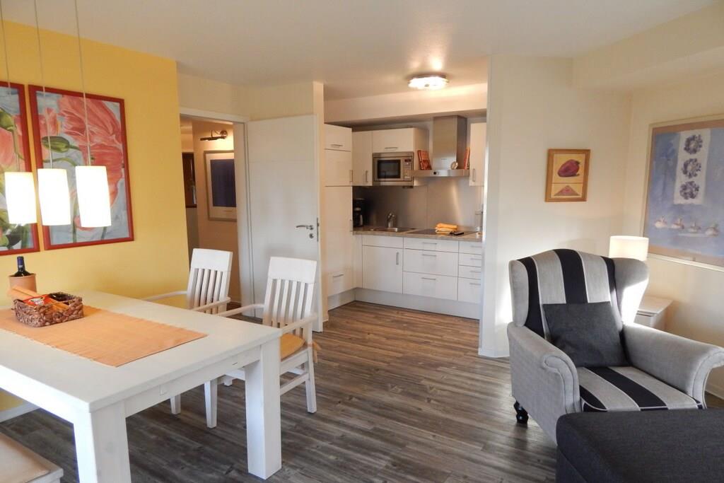 Die Ausstattung der Ferienwohnung ist luxuriös und wird bei Ihnen keine Wünsche offen lassen. Exklusive Möbel, Accessoires und allerlei Annehmlichkeiten sind stilvoll aufeinander abgestimmt. Im hochwertigen Badezimmer mit schöner Granitausstattung finden Sie eine Dusche mit Sitzgelegenheit, ein Doppelwaschbecken, einen Handtuchwärmer mit Handtüchern und sogar Bademäntel sind vorhanden. Die geräumige Küche ist mit allem ausgestattet. Im gemütlichen Wohnzimmer befinden sich ein Telefon, TV, DVD-Player/Stereoanlage sowie W-LAN. Das Schlafzimmer ist klimatisiert. Der eigene überdachte Balkon lädt zum Verweilen ein. Die gesamte Ferienwohnung verfügt zudem über eine Fußbodenheizung. Genießen sie die Ruhe in unserem Wellnessbereich mit finnischer Sauna und Wärmekabine im EG.