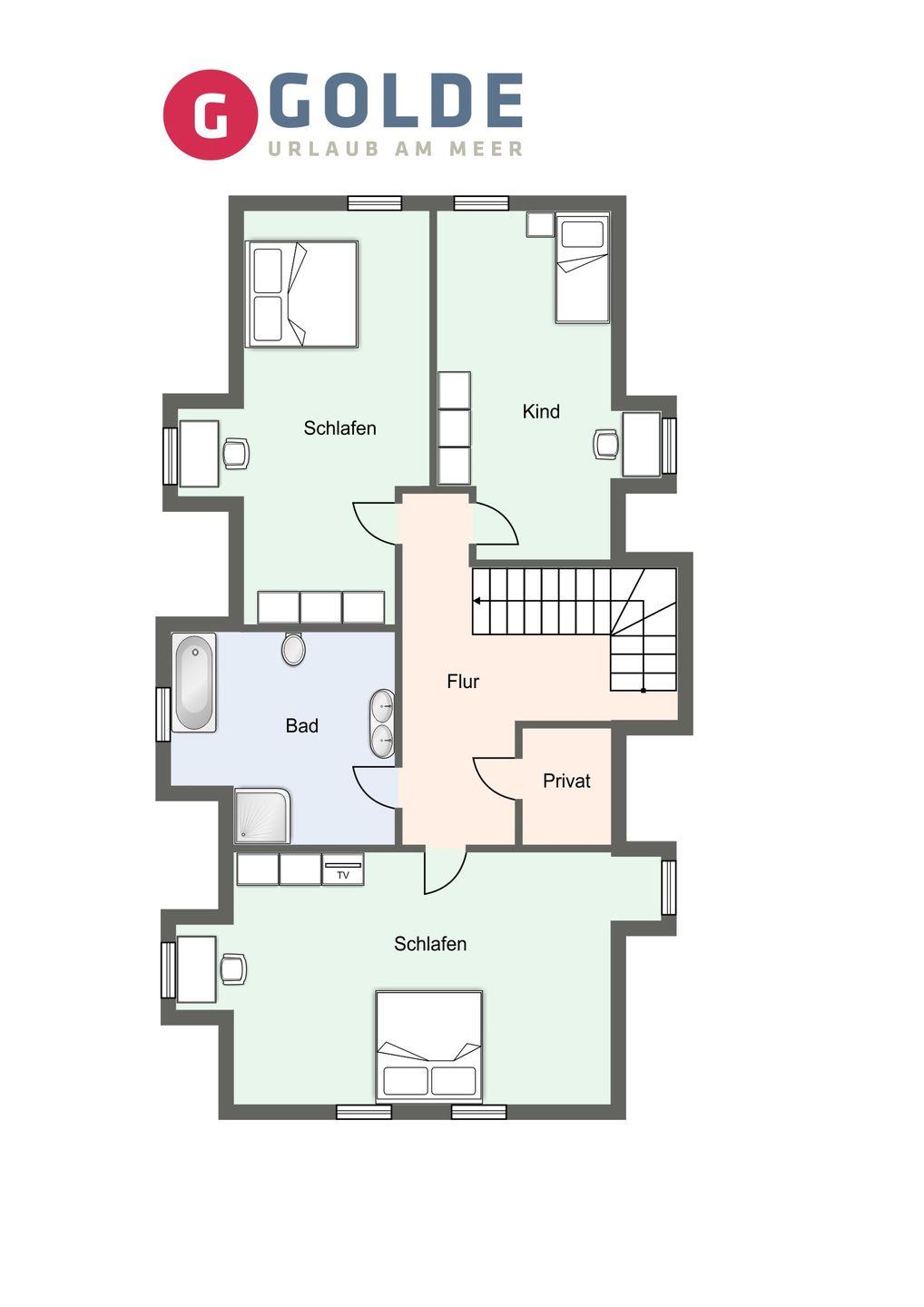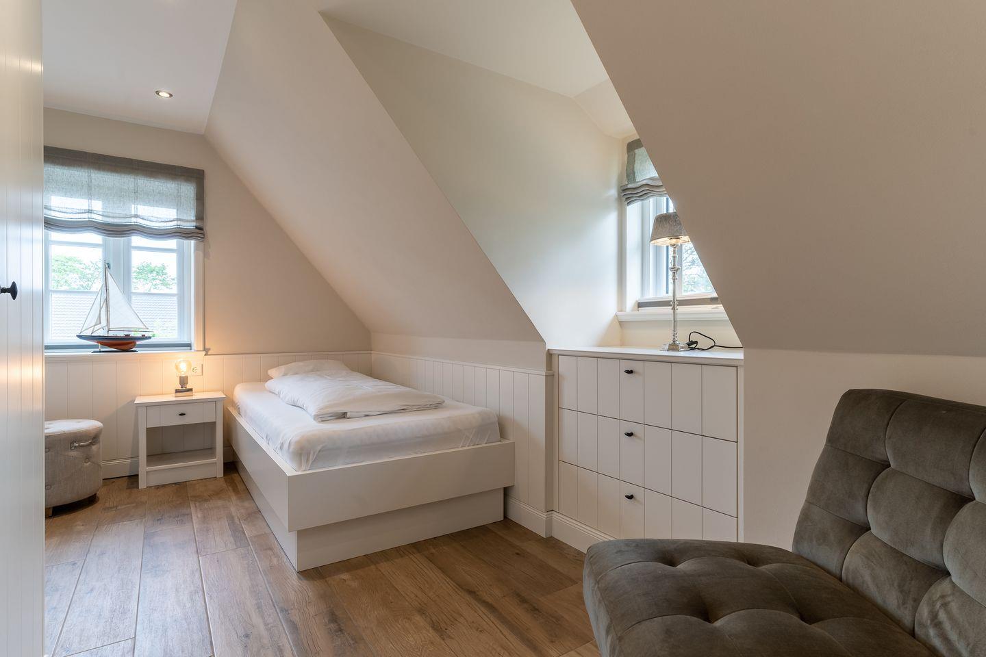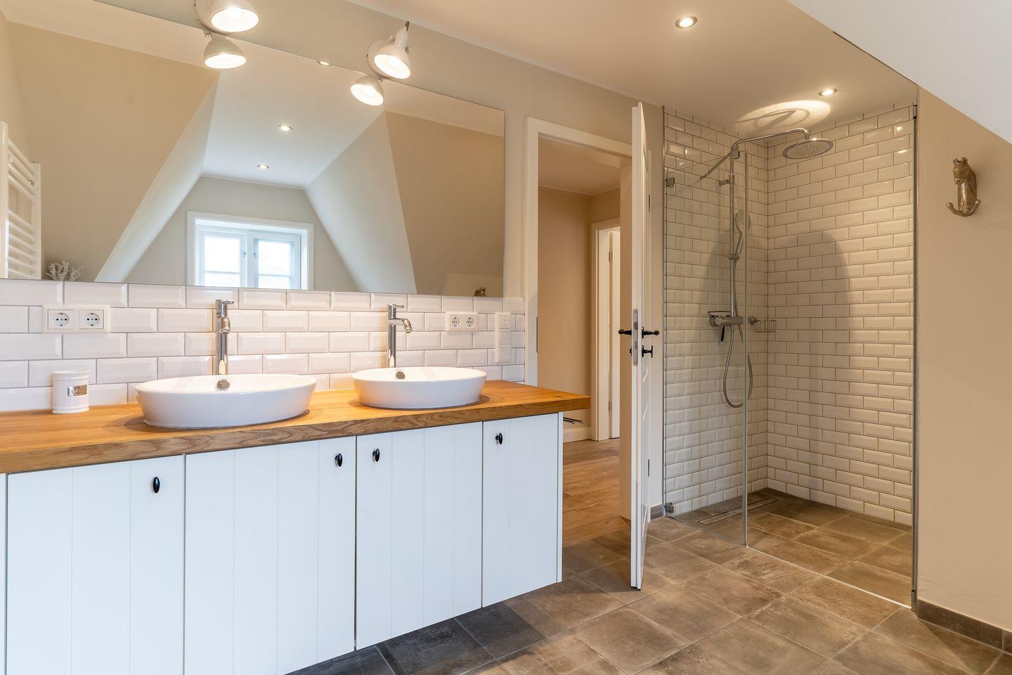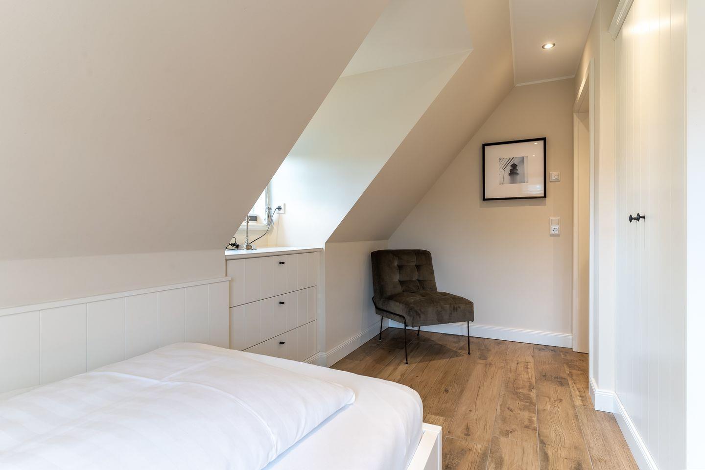 Eine Holztreppe führt Sie ins Obergeschoss, wo zwei weitere stilvoll eingerichtete Schlafzimmer mit komfortablen Doppelbetten (1x 200 x 210 cm + TV und 1x 160 x 200 cm) und ein weiteres Schlafzimmer mit einem Einzelbett (1x 100 x 200 cm) auf Sie warten. Ein geräumiges Badezimmer mit Dusche und Badewanne sorgt für zusätzlichen Komfort.