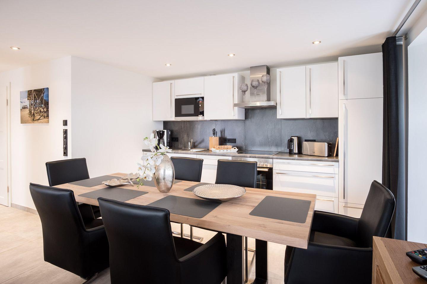 Die angrenzende Wohnküche ist mit allen wichtigen Geräten voll ausgestattet und lädt zum gemeinsamen Kochen ein.