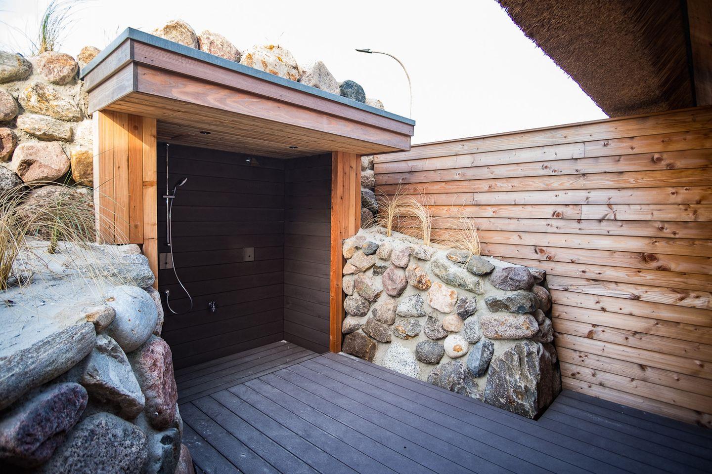 Gartenmöbel und ein Strandkorb laden Sie zur Erholung ein. Der Garten ist wunderbar geschützt und mit heimischen Pflanzen angelegt.