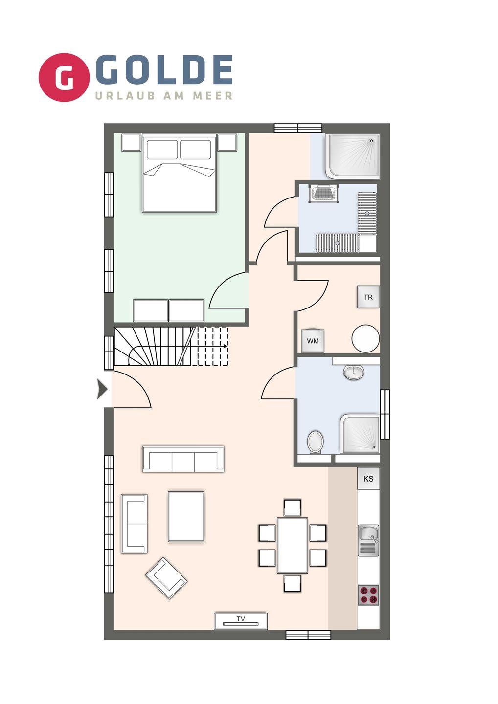 Im Erdgeschoss ist ebenso ein Doppelschlafzimmer mit TV, sowie ein gegenüberliegendes Duschbad mit WC und eine Sauna mit Zugang in den Garten.
