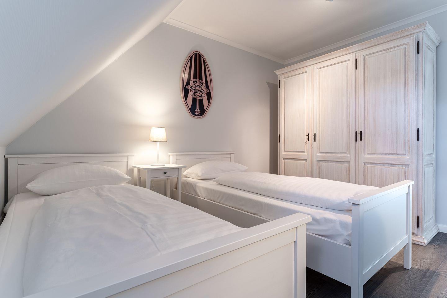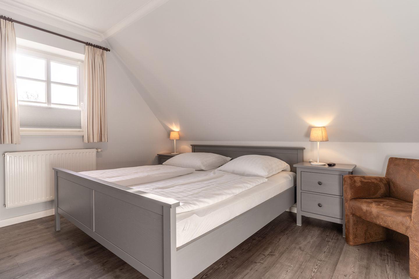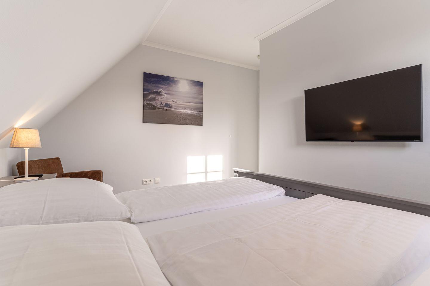 Über eine Holztreppe im Flur gelangt man in das Obergeschoss mit zwei Schlafzimmern. Eines verfügt über ein 180er Bett mit TV und das andere über 2 x 90er Einzelbetten. Außerdem ist im Obergeschoss ein Duschbad.