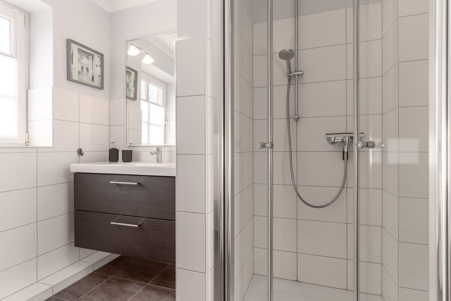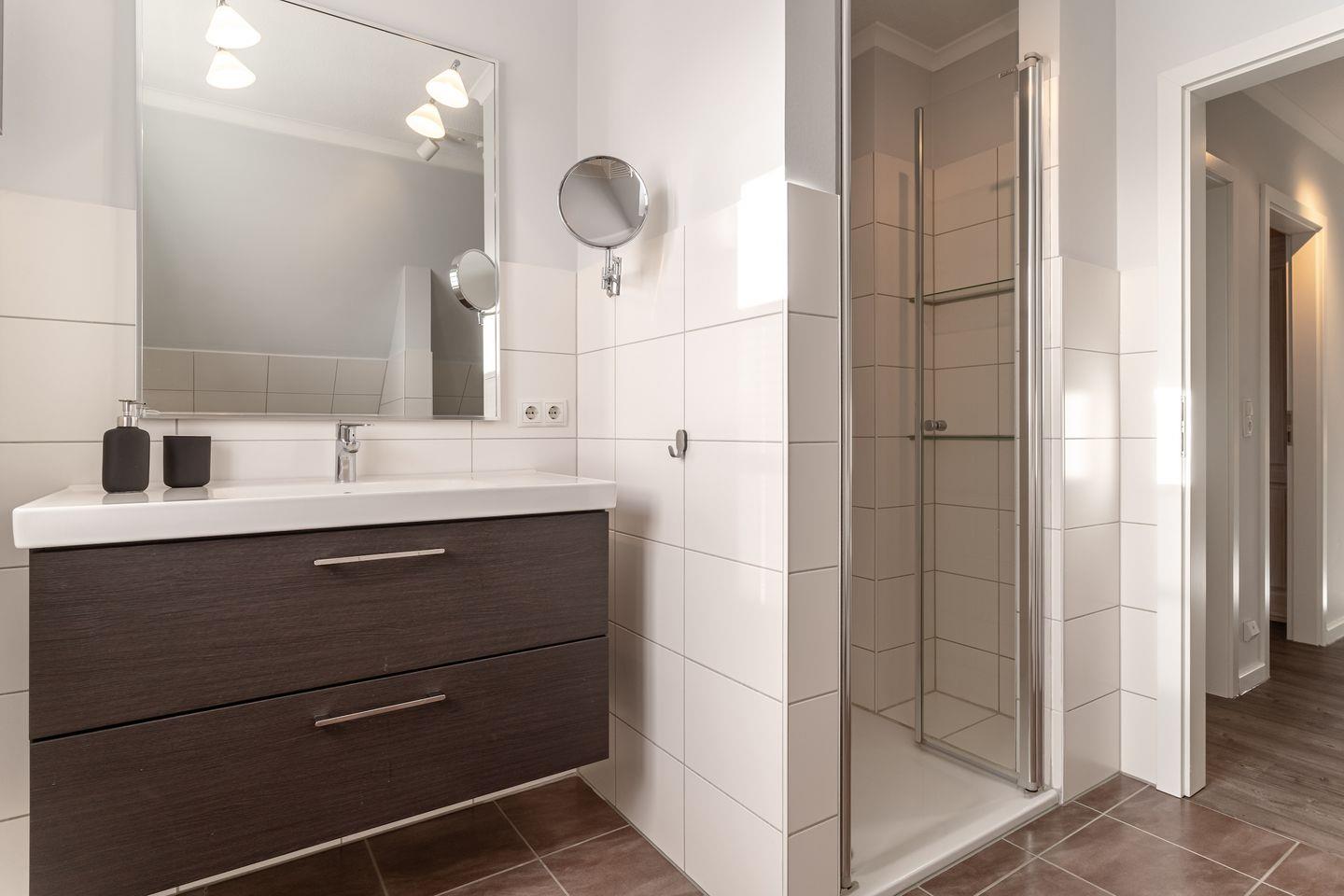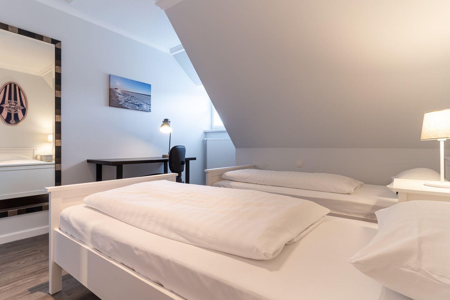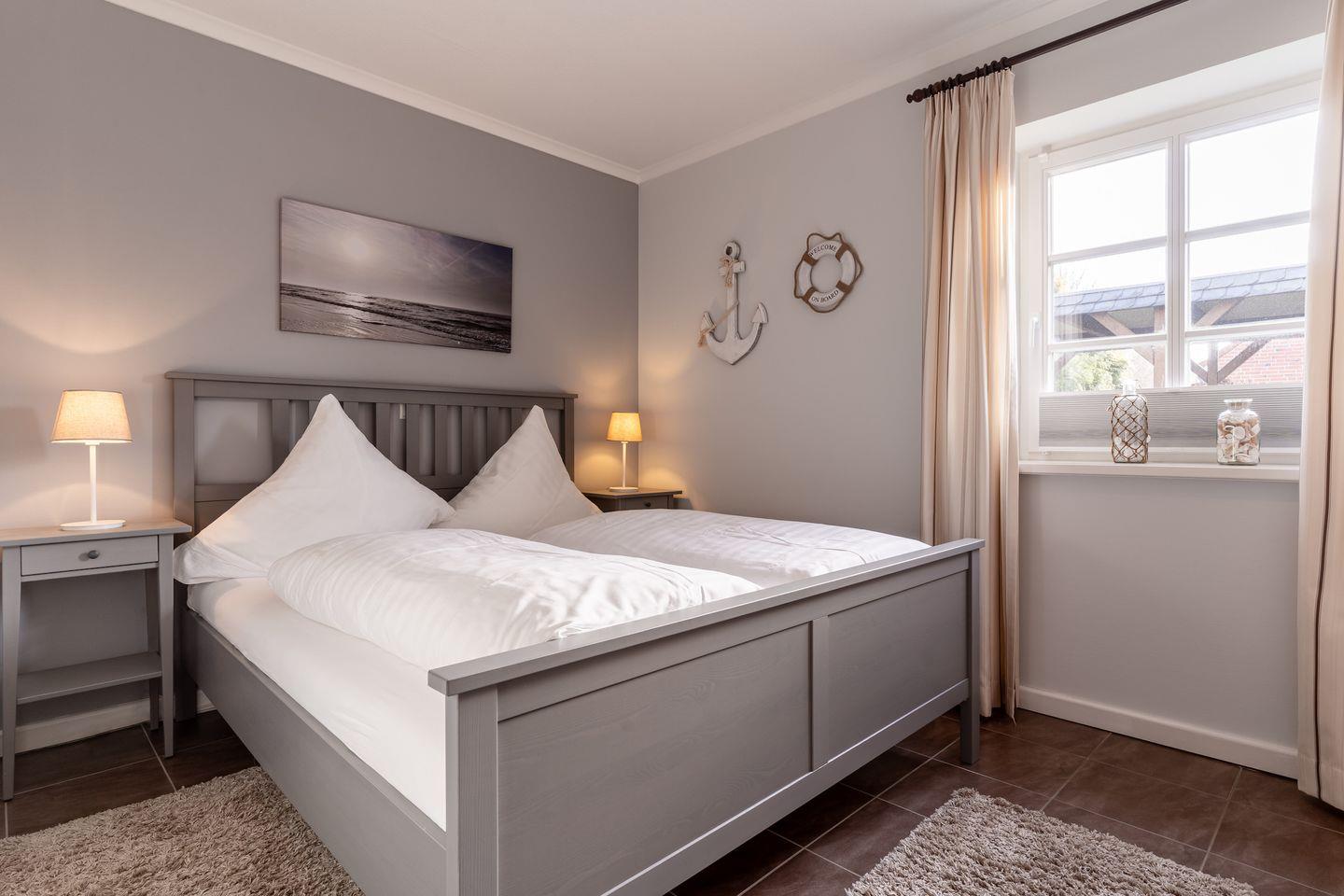 Über eine Holztreppe im Flur gelangt man in das Obergeschoss mit zwei Schlafzimmern. Eines verfügt über ein 180er Bett mit TV und das andere über 2 x 90er Einzelbetten. Außerdem ist im Obergeschoss ein Duschbad.