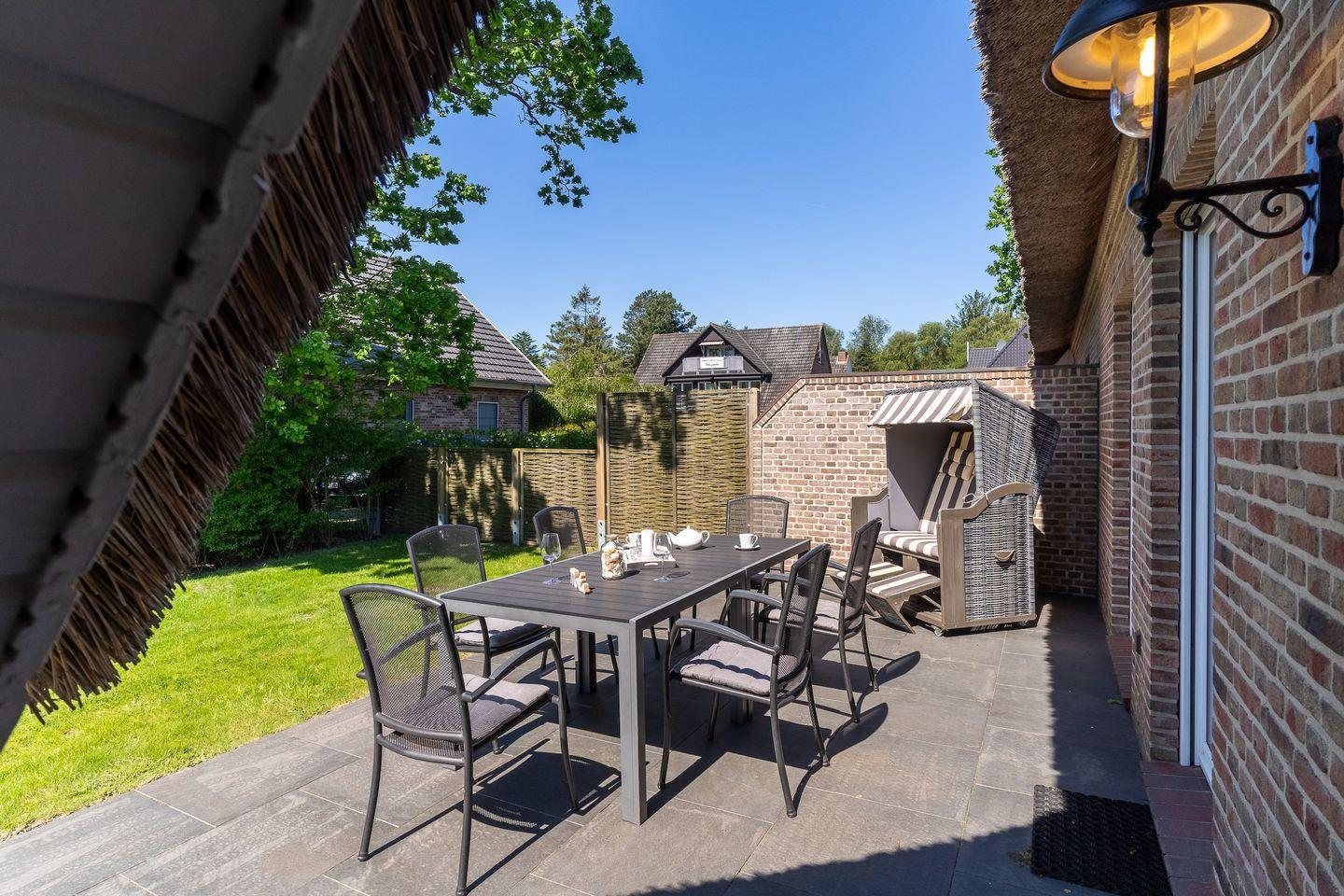 Einen wunderschönen Garten mit heimischen Pflanzen erreichen Sie direkt vom Wohnraum. Hier befindet sich eine Terrasse mit Gartenmöbel und ein Strandkorb.