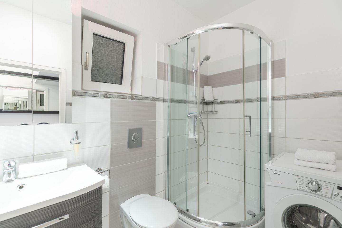 Das modernisierte und hell gestaltete Bad ist mit einer Dusche, Waschbecken und WC ausgestattet. Es verfügt zusätzlich über eine Handtuchheizung und eine Waschmaschine.