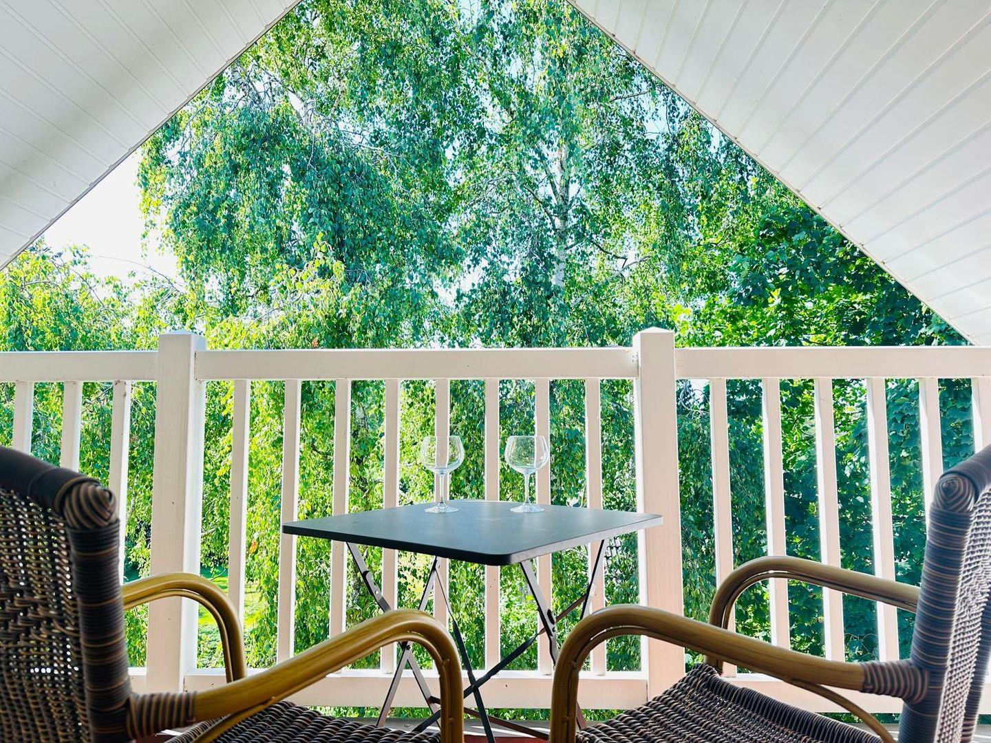 Genießen Sie entspannte Momente auf dem zum Garten ausgerichteten, möblierten Balkon mit bequemen Polsterauflagen und Sonnenschirm. Für Abwechslung sorgt die möblierte Loggia, die zur Straßenseite hin ausgerichtet ist.