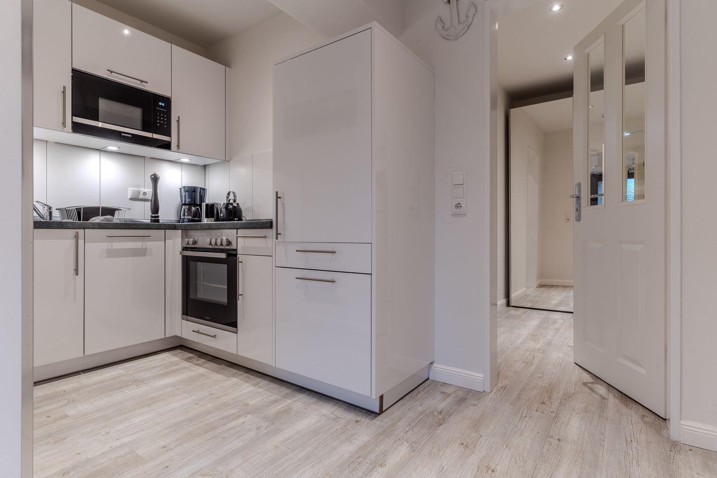 Die moderne, 44m² große Ferienwohnung, welche im Jahr 2020 vollständig saniert wurde, liegt im Erdgeschoss und bietet bis zu 2 Personen Platz für einen unvergesslichen Urlaub in St. Peter-Ording. Dank der Erdgeschosslage eignet sich die Ferienunterkunft wunderbar für mobilitätseingeschränkte Gäste. Die Ferienwohnung verfügt über eine kleine Terrasse. Auch der Urlaub mit Hund in St. Peter Ording ist hier möglich, bis zu 2 Hunde sind hier herzlich willkommen. Das moderne Wohnzimmer wirkt durch die große Fensterfront wunderbar hell und freundlich. Zur Ausstattung gehören eine komfortable Couch und der große Esstisch, an dem die ganze Familie Platz findet. Für die multimediale Unterhaltung sorgen ein großer Flachbild-TV, Radio mit Bluetooth und kostenfreies W-LAN. Für die Versorgung im Urlaub sorgt die vollumfassend ausgestattete Küche der Ferienwohnung. Hier stehen neben Cerankochfeld und Backofen noch Kühlschrank, Mikrowelle und Nespresso-Maschine bereit. Orangenpresse und Milchaufschäumer gehören ebenfalls zum Inventar. Im hellen, einladenden Schlafzimmer steht ein komfortables 180x200cm Boxspringett zur Verfügung. Zur edlen Ferienwohnung gehören weiterhin Duschbad mit WC, Haartrockner und Schminkspiegel. Alle Fenster der Ferienwohnung sind mit Fliegenschutzgitter und Verdunklungsplissees ausgestattet. Die große Fensterfront ist mit elektrischem Außenrollo ausgestattet, um Licht und Sichtschutz nach Belieben regulieren zu können. Feriengästen steht zudem eine kostenfrei nutzbare Waschmaschine zur Verfügung.