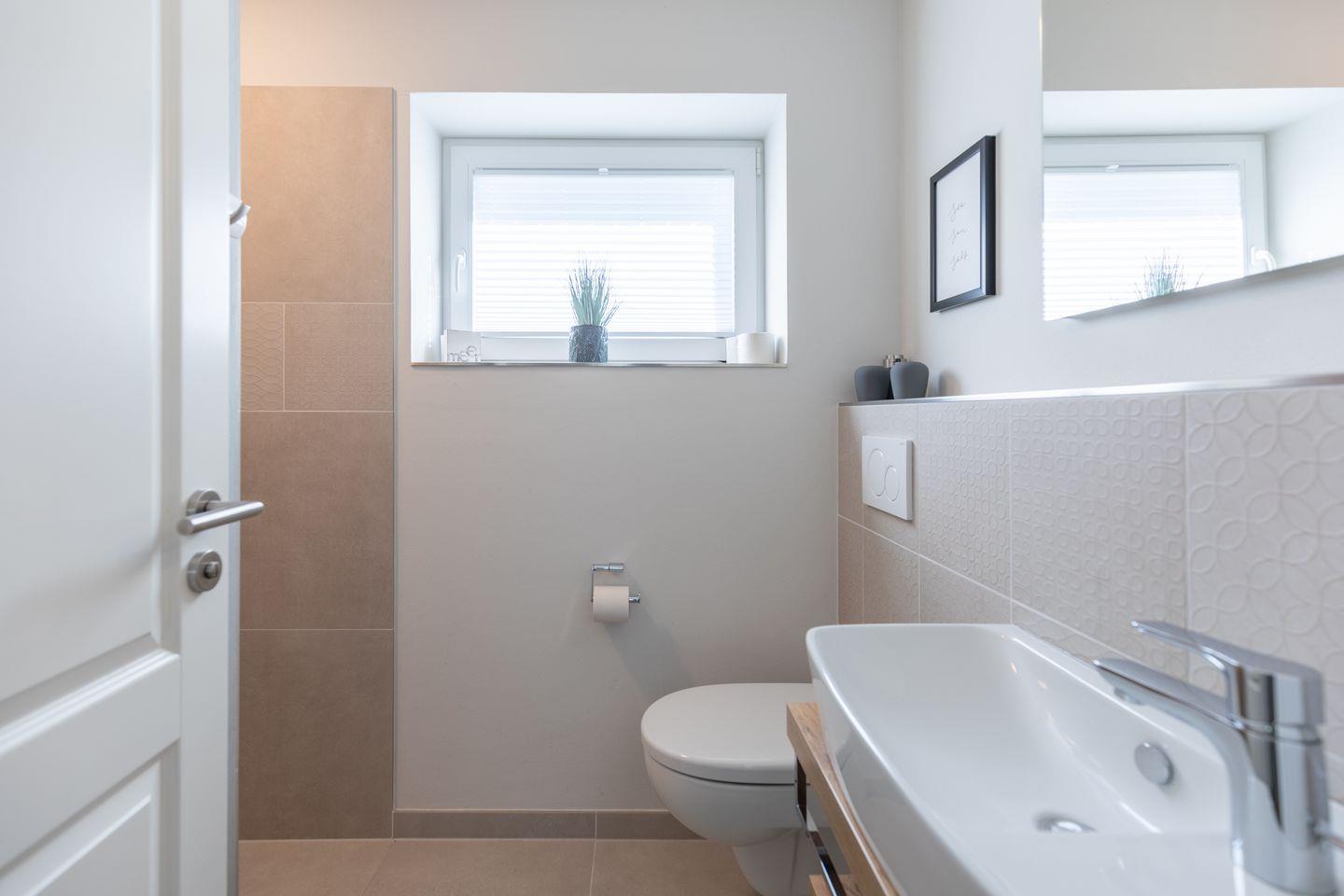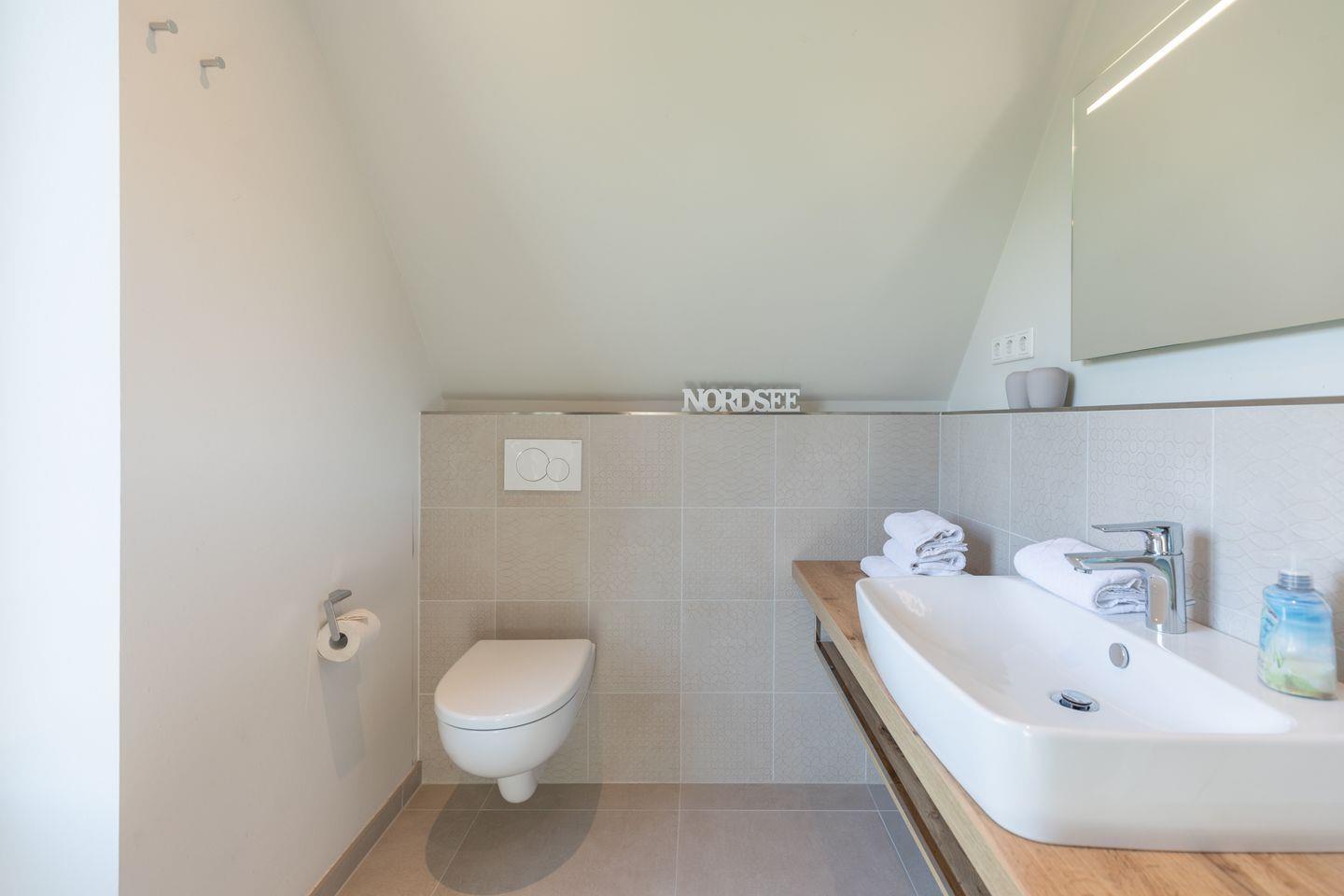 Das große, chic designte Duschbad bietet Ihnen neben einer entspannenden Dusche einen Waschtisch und ein WC.