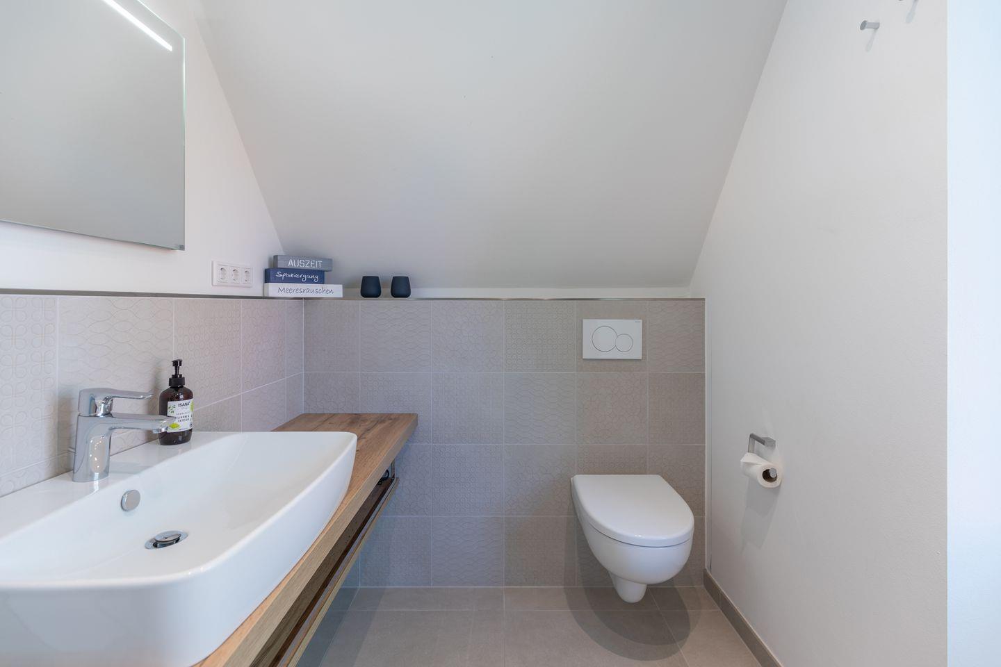 Das große, schick designte Duschbad bietet Ihnen neben einer entspannenden Dusche einen Waschtisch und ein WC.