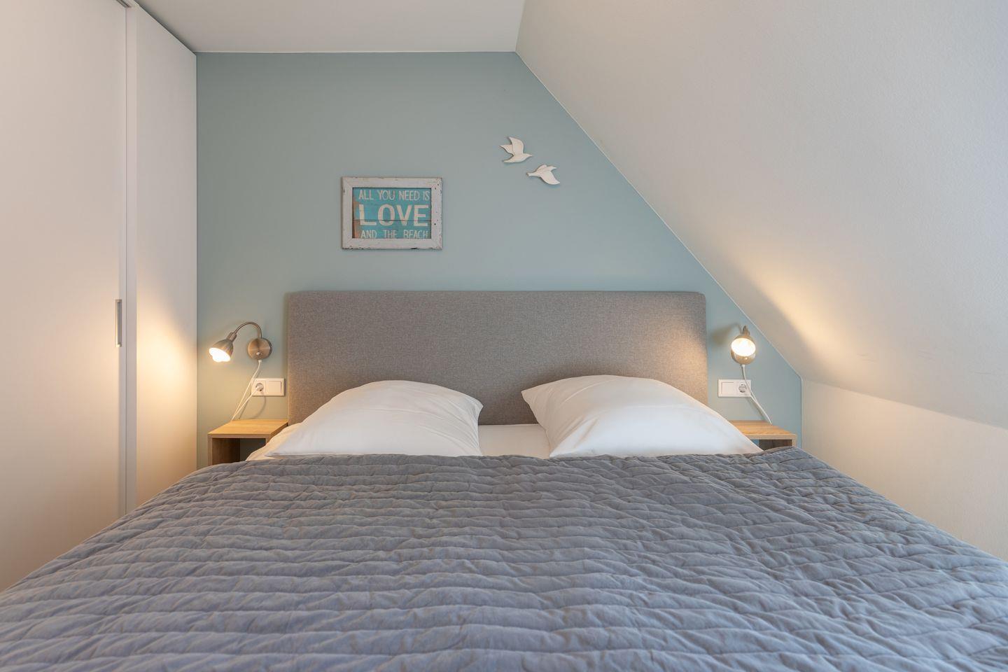 Über eine geschlossene Holztreppe erreichen Sie das erste Obergeschoss mit einem Elternschlafzimmer mit Doppelbett (180 × 200) und einem weiteren Schlafraum mit zwei Einzelbetten. Über eine weitere Treppe erreichen Sie den ausgebauten Spitzboden mit einem weiteren Einzelbett und einer Spielecke für die Kleinen.
