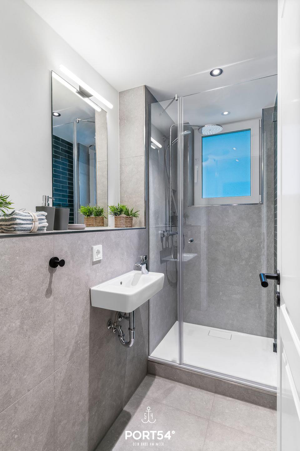 Im Badezimmer erwartet Sie eine bodengleiche Dusche, WC, Waschbecken, Spiegel und Kosmetikspiegel, warmes Wasser sowie ein Fenster. Ein Haartrockner ist vorhanden.