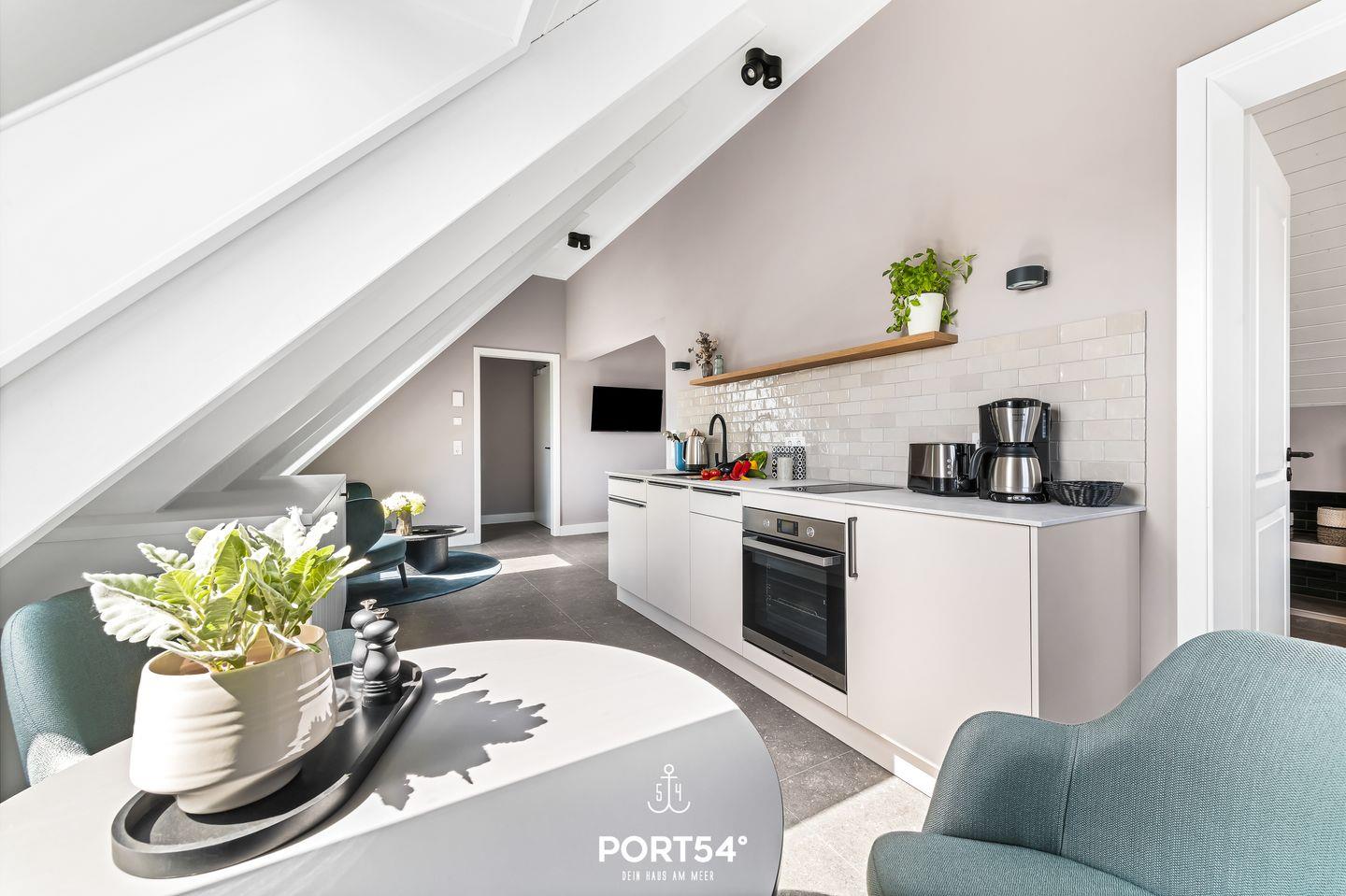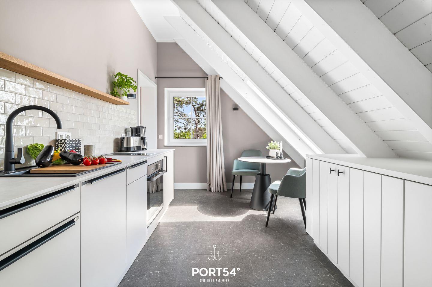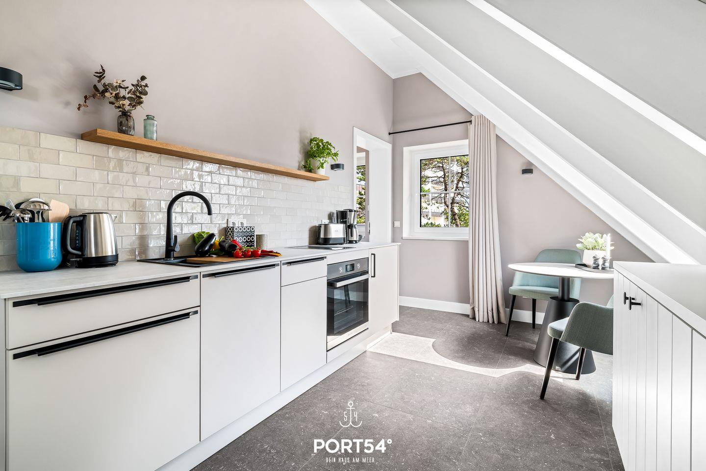 Die offene Küche ist umfassend eingerichtet und eignet sich ideal zur Selbstversorgung, Cerankochfeld, Backofen, Kühlschrank mit Gefrierfach, Spülmaschine sowie Küchenutensilien, Geschirr und Besteck sind vorhanden. Ergänzt wird die Ausstattung durch Kaffeemaschine, Wasserkocher, Toaster, Küchenmaschine und Mixer; Geschirrhandtücher und ein Abfalleimer sind ebenfalls bereitgestellt.