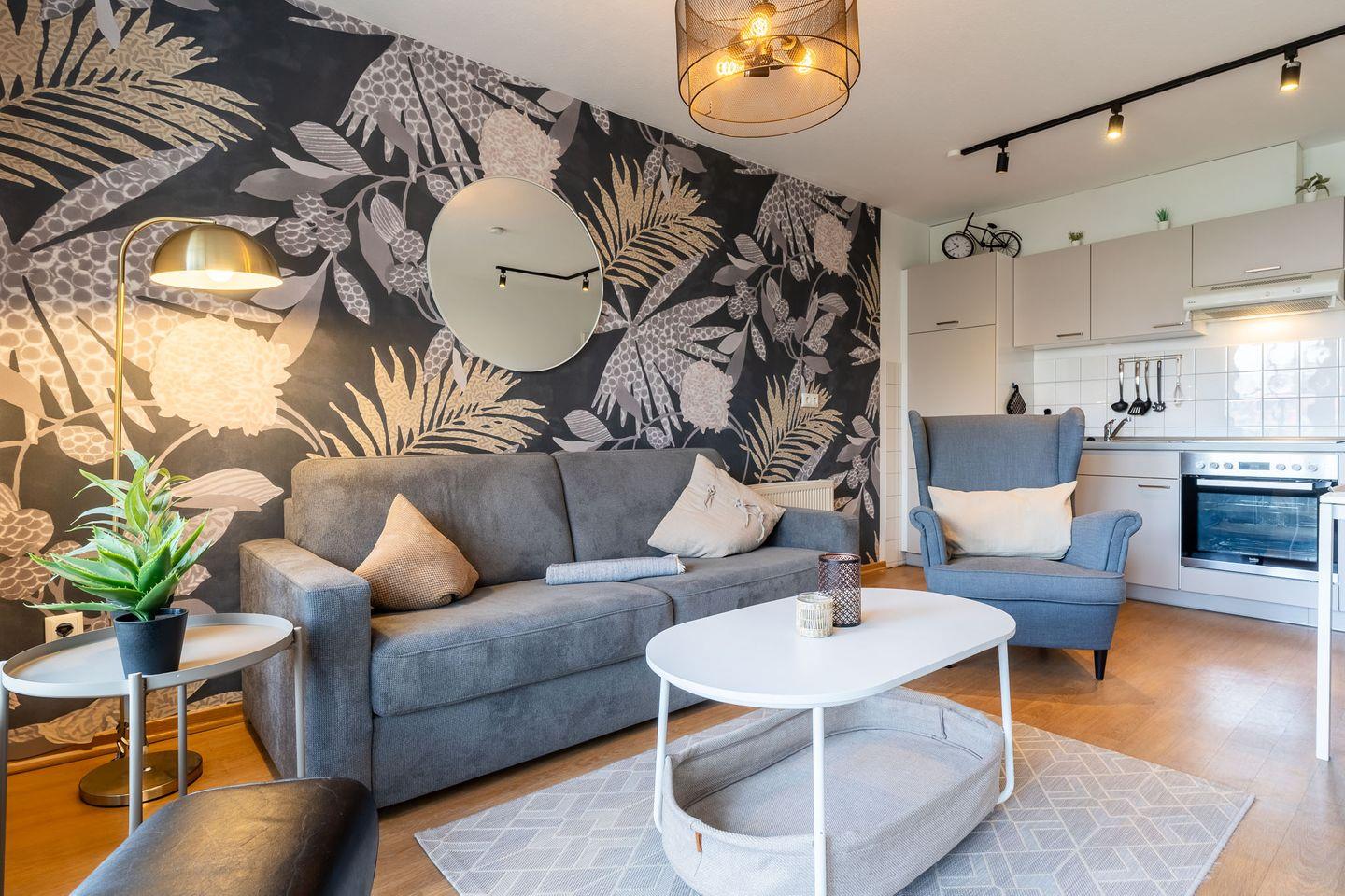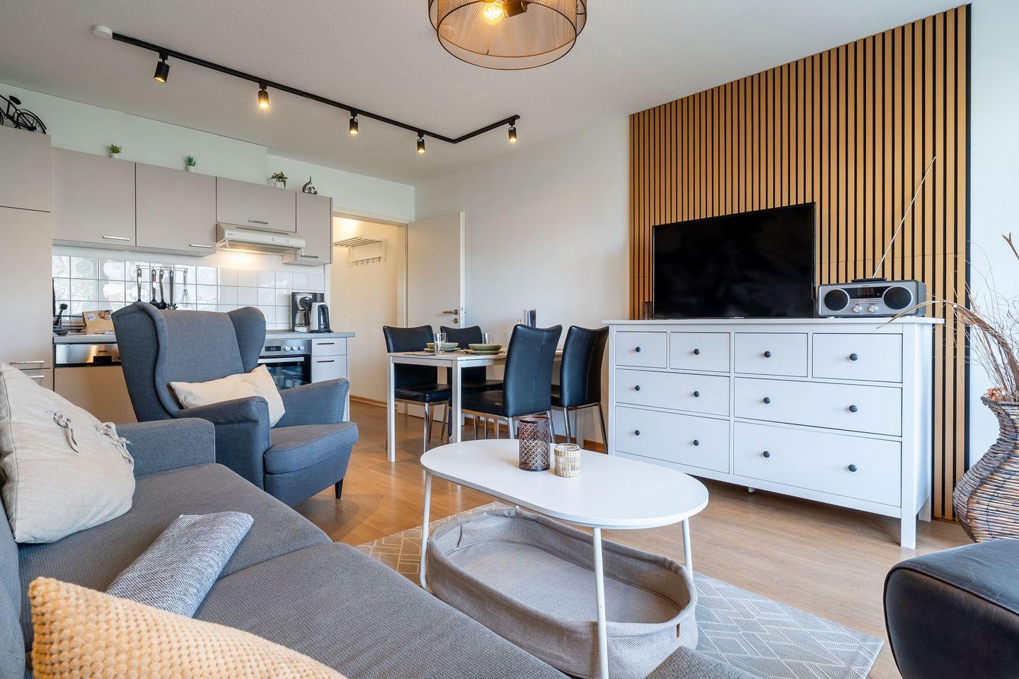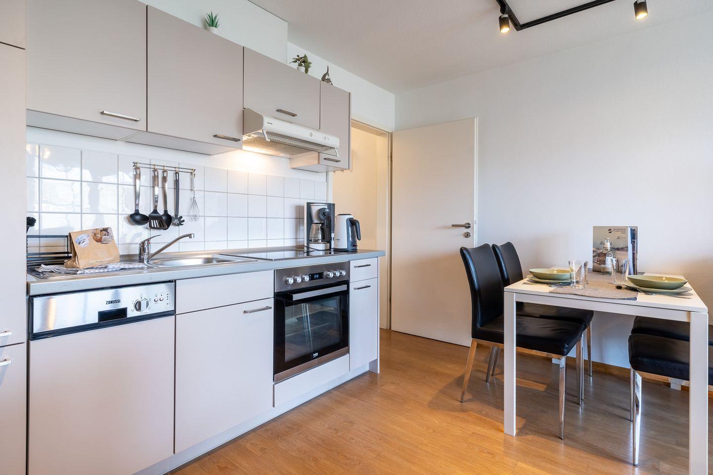 Der Wohnbereich dient gleichzeitig als Essbereich und bietet ausreichend Platz für gesellige Abende und gemeinsame Mahlzeiten. In der offenen Küchenzeile finden Sie alles, was Sie für die Selbstversorgung benötigen, inklusive Geschirrspüler und Backofen. Hier können Sie nach Herzenslust kochen und Ihre Lieblingsgerichte zubereiten. Das Badezimmer wurde komplett erneuert, verfügt über eine bodengleiche Dusche und wurde modern und zeitlos gestaltet.