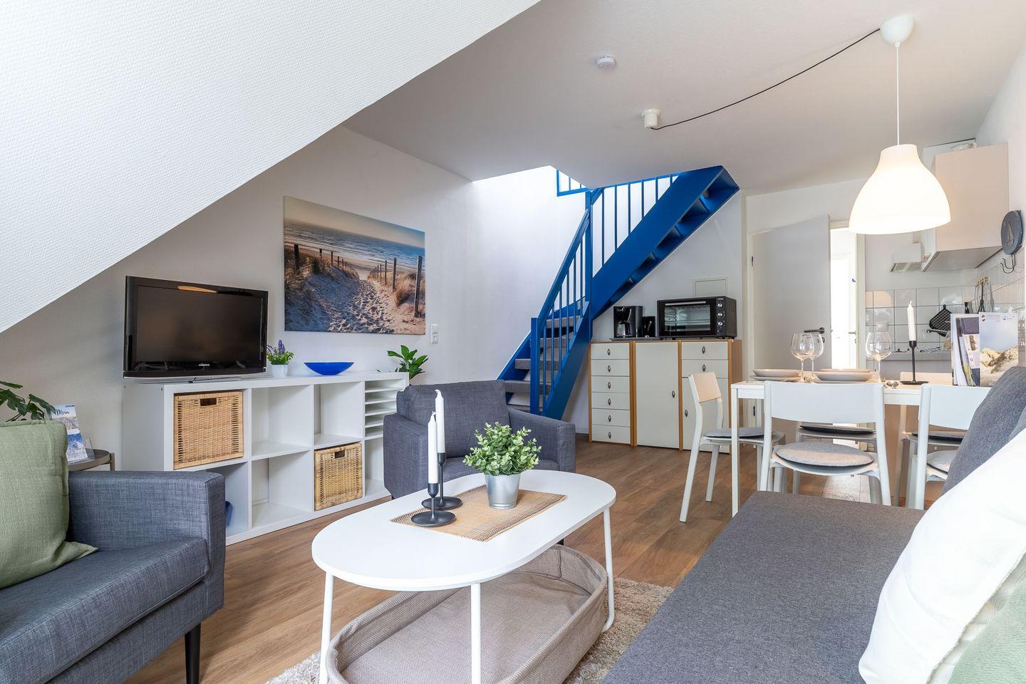 Herzlich willkommen in unserer charmanten Maisonette-Wohnung in Sankt Peter-Ording! Die Wohnung erstreckt sich über zwei Etagen und bietet auf ca. 55 qm ausreichend Platz für bis zu vier Personen. Im ersten Stockwerk finden Sie ein gemütliches Schlafzimmer mit einem Freundschaftsbett, das bei Bedarf in zwei Schlafplätze verwandelt werden kann. Der einladende Wohnraum ist mit einem Schlafsofa und zwei bequemen Sesseln ausgestattet. Die integrierte Küchenzeile verfügt über eine Geschirrspülmaschine, einen Backofen und alle wichtigen Küchenutensilien, sodass Sie sich während Ihres Aufenthalts bequem selbst versorgen können.
