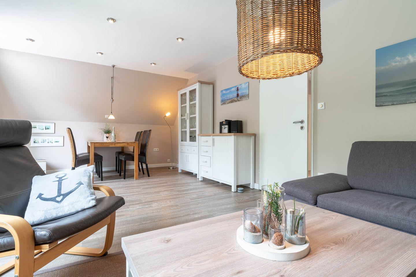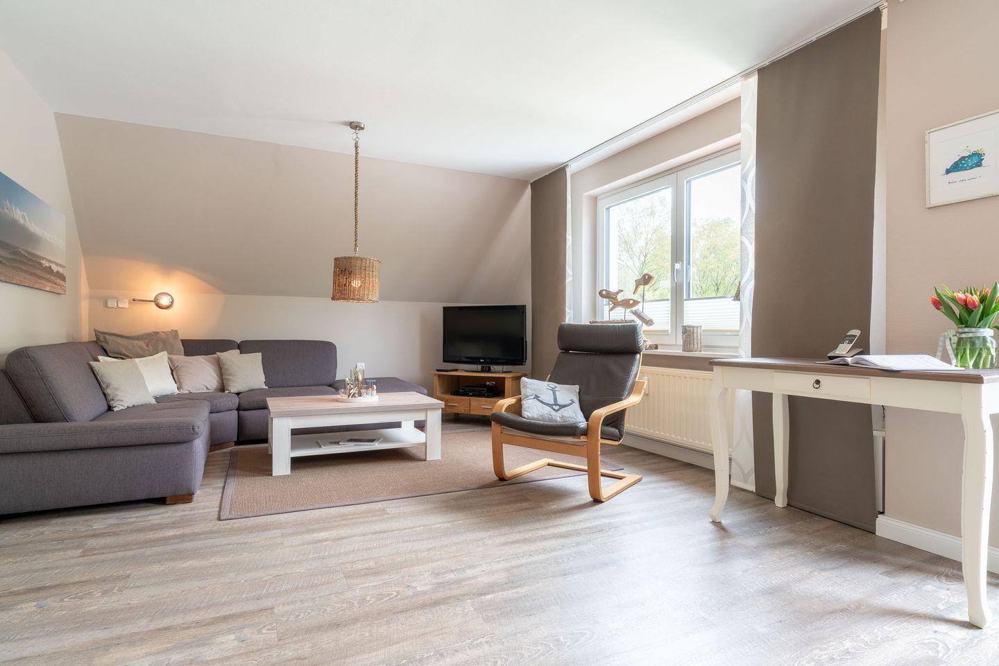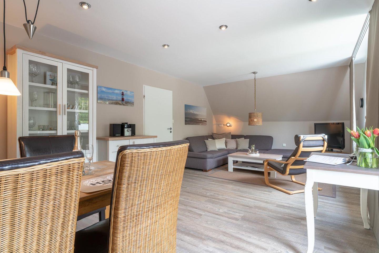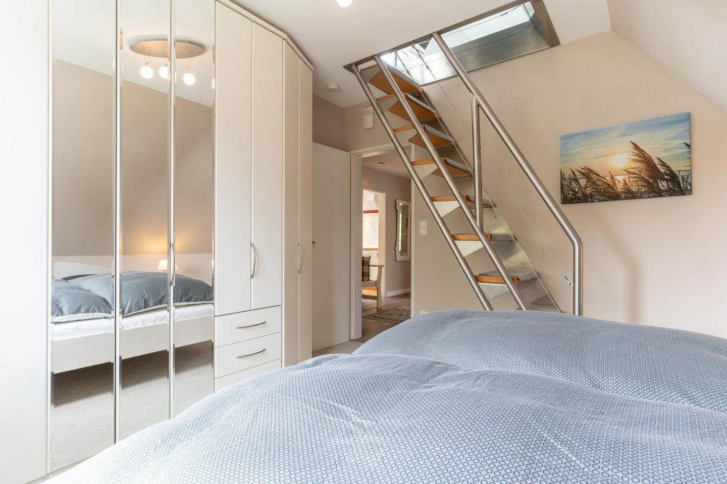 Die Ferienwohnung wird über einen separaten Eingang erreicht. Sie verfügt über insgesamt ca. 110 qm Wohnfläche. Im 1. Obergeschoss erreichen Sie von einem großzügigen Flur folgende Räume : kombinierter Wohn-Essbereich: gemütliche Couchgarnitur, Esstisch für 5 Pers., TV, Stereoanlage, von hier der Zugang zur 45 qm großen, nicht einsehbaren Dachterrasse in Süd-West-Lage, eine modern ausgestattete Küche mit Tisch und Sitzgelegenheit für 2 Pers., Geschirrspüler, zwei separate Schlafzimmer mit jeweils einem 1,80 breitem Doppelbett, Kleiderschrank und Nachtkonsolen, einen Abstellraum mit Waschmaschine, und das Badezimmer mit Duschbad und Fußbodenheizung. Über eine Edelstahltreppe gelangen Sie vom Schlafzimmer 1 in den offenen, lichtdurchfluteten Dachbodenbereich. Hier befindet sich als Ausweich- und Kuschelbereich ein weiteres Doppelbett sowie ein Einbauschrank. Die Dachfenster sind mit Verdunklung ausgestattet. Ein Flachbildfernseher sowie ein DVD-Player, lassen auch hier keine Wünsche übrig.