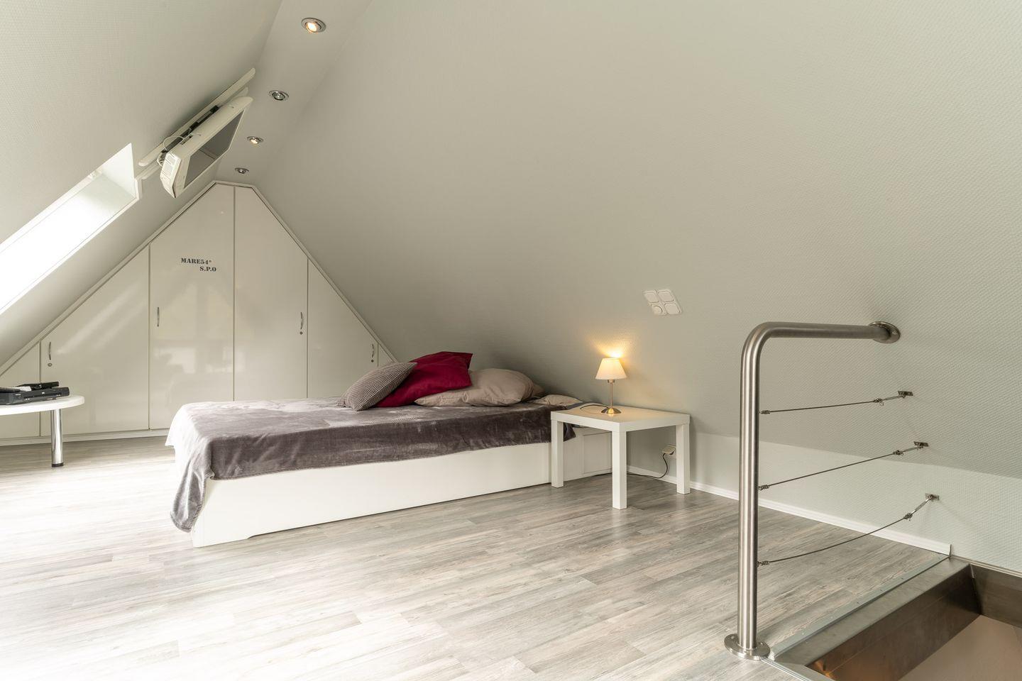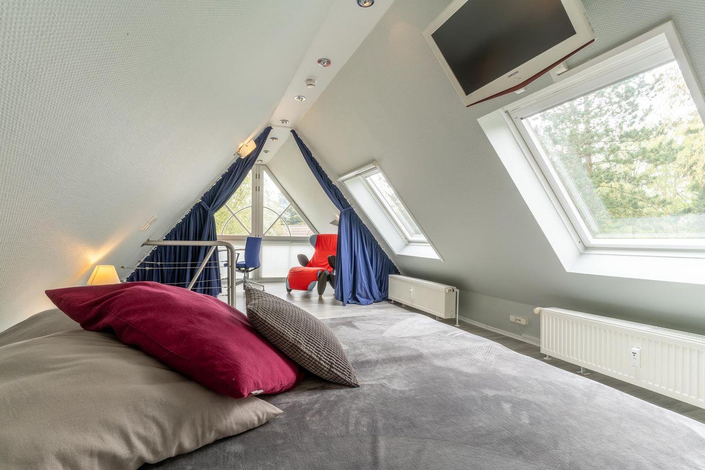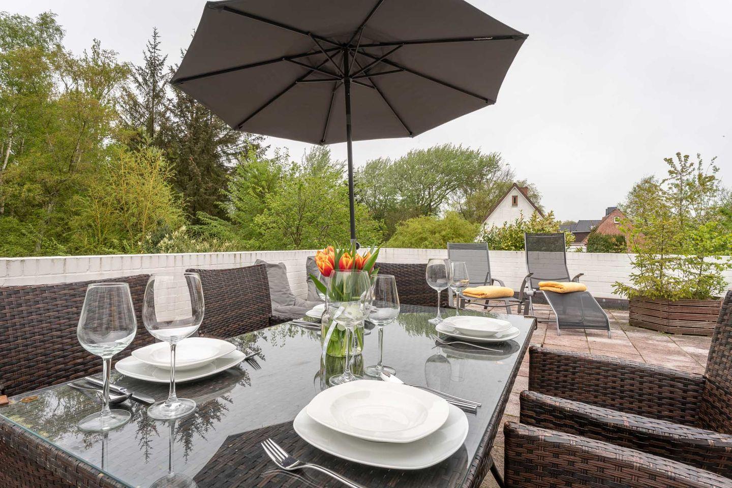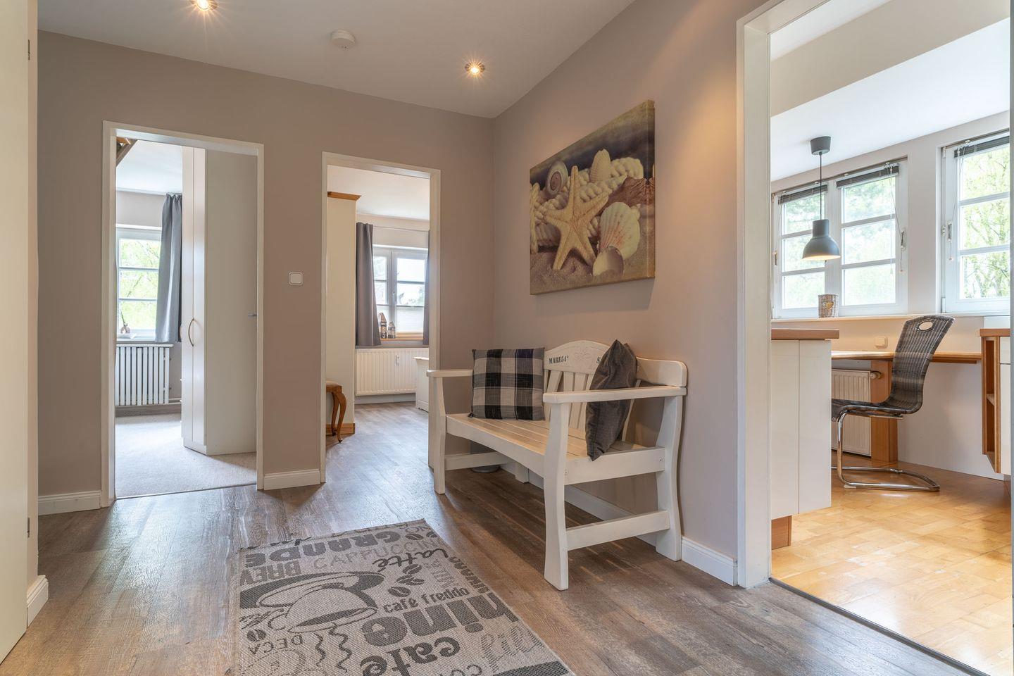 Die Ferienwohnung wird über einen separaten Eingang erreicht. Sie verfügt über insgesamt ca. 110 qm Wohnfläche. Im 1. Obergeschoss erreichen Sie von einem großzügigen Flur folgende Räume : kombinierter Wohn-Essbereich: gemütliche Couchgarnitur, Esstisch für 5 Pers., TV, Stereoanlage, von hier der Zugang zur 45 qm großen, nicht einsehbaren Dachterrasse in Süd-West-Lage, eine modern ausgestattete Küche mit Tisch und Sitzgelegenheit für 2 Pers., Geschirrspüler, zwei separate Schlafzimmer mit jeweils einem 1,80 breitem Doppelbett, Kleiderschrank und Nachtkonsolen, einen Abstellraum mit Waschmaschine, und das Badezimmer mit Duschbad und Fußbodenheizung. Über eine Edelstahltreppe gelangen Sie vom Schlafzimmer 1 in den offenen, lichtdurchfluteten Dachbodenbereich. Hier befindet sich als Ausweich- und Kuschelbereich ein weiteres Doppelbett sowie ein Einbauschrank. Die Dachfenster sind mit Verdunklung ausgestattet. Ein Flachbildfernseher sowie ein DVD-Player, lassen auch hier keine Wünsche übrig.