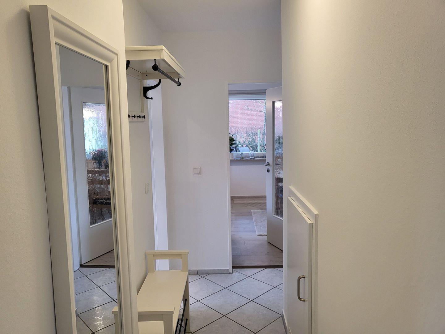Im Eingangsbereich ist Platz für Garderobe und Schuhe. Von hier aus geht es in alle anderen Räumlichkeiten.