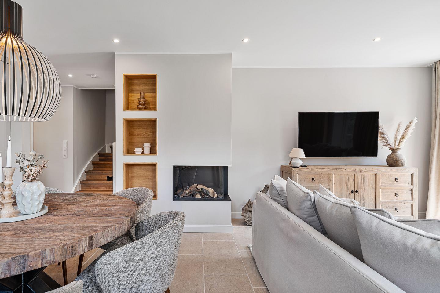 Der offene Wohnbereich verbindet einen einladenden Wohnraum mit einer voll ausgestatteten Küche. Hier finden Sie alle Annehmlichkeiten, die das Herz eines jeden Kochs höher schlagen lassen. Der gemütliche Gas-Kamin sorgt in den kühleren Monaten für eine wohlige Atmosphäre. Genießen Sie gemeinsame Abende mit Ihren Liebsten vor dem Fernseher – insgesamt stehen Ihnen vier Fernseher zur Verfügung, sodass jeder sein Lieblingsprogramm genießen kann.