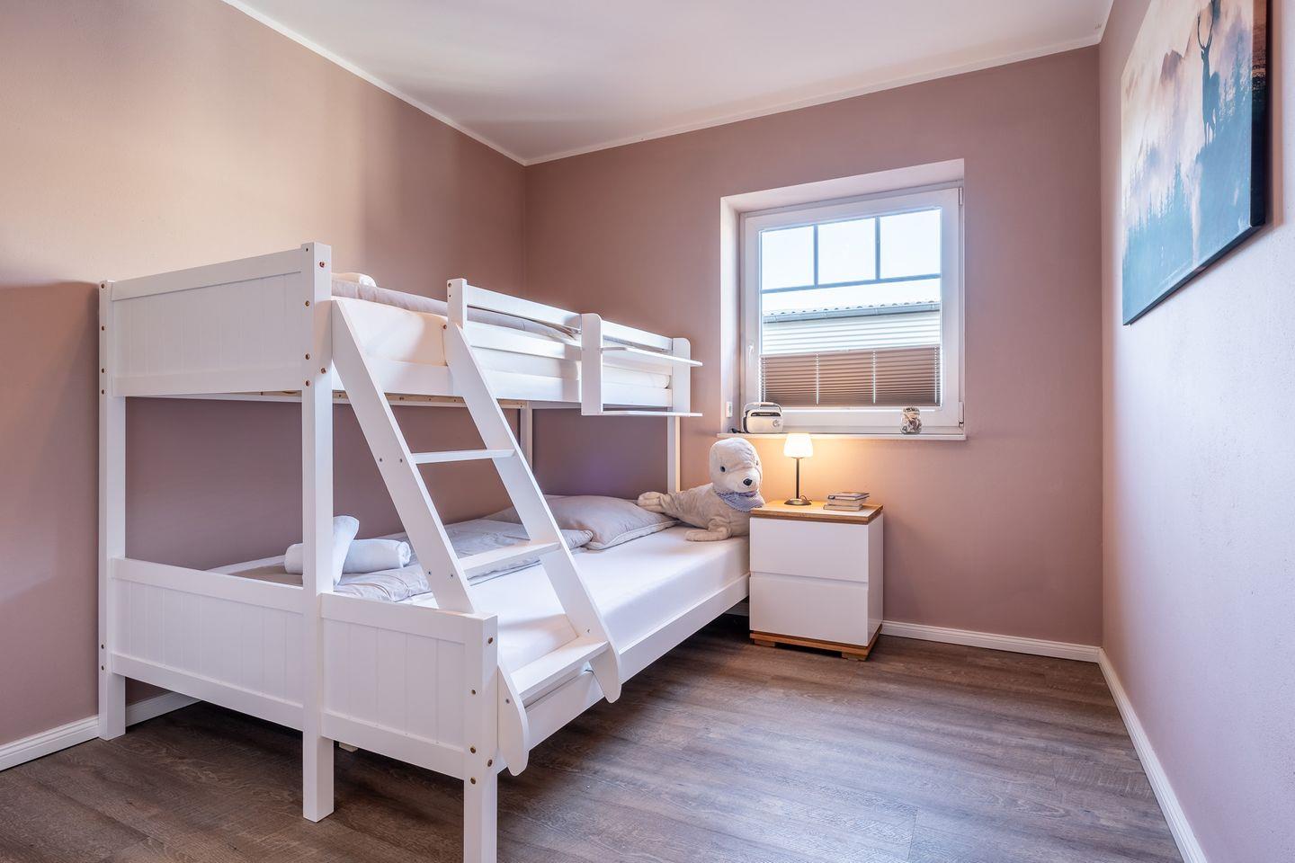 Das Hauptschlafzimmer ist mit einem komfortablen Doppelbett ausgestattet, das zu erholsamen Nächten einlädt. Im zweiten Schlafzimmer erwartet Sie ein praktisches Etagenbett – mit einer großzügigen Liegefläche von 1,40 x 2,00 m unten und 0,90 x 2,00 m oben – perfekt für Kinder oder weitere Gäste. Hier können die Kleinen träumen und die Urlaubstage entspannt ausklingen lassen.