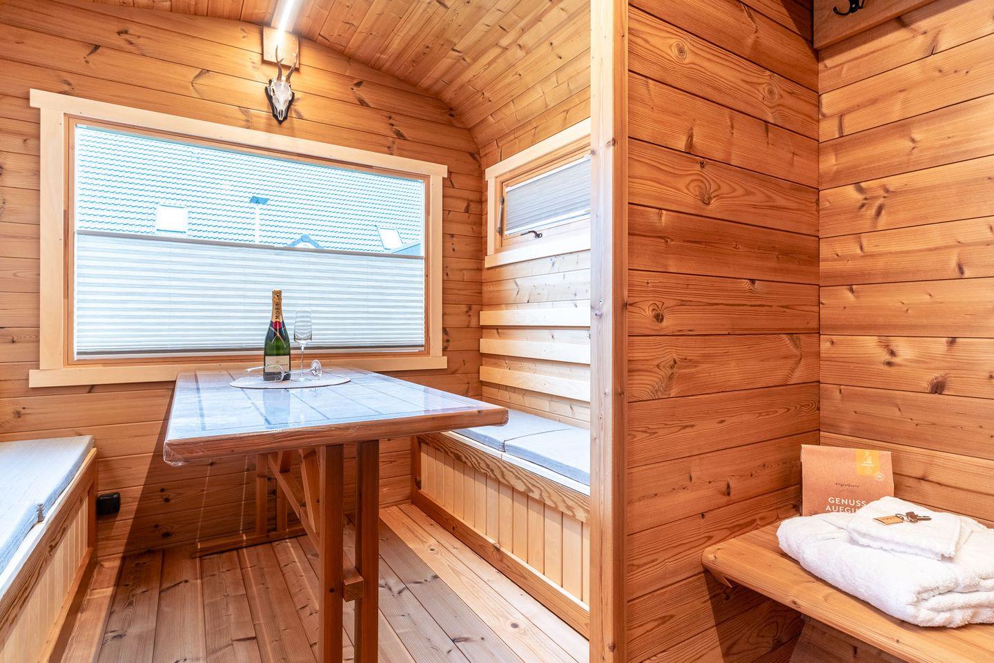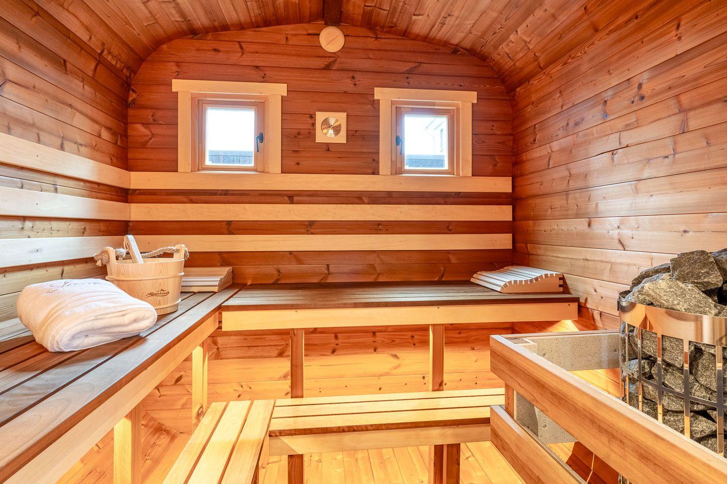 Die Sauna im Außenbereich kann für eine Gebühr von 50,00 € hinzugebucht werden – ideal zum Entspannen nach einem erlebnisreichen Tag.