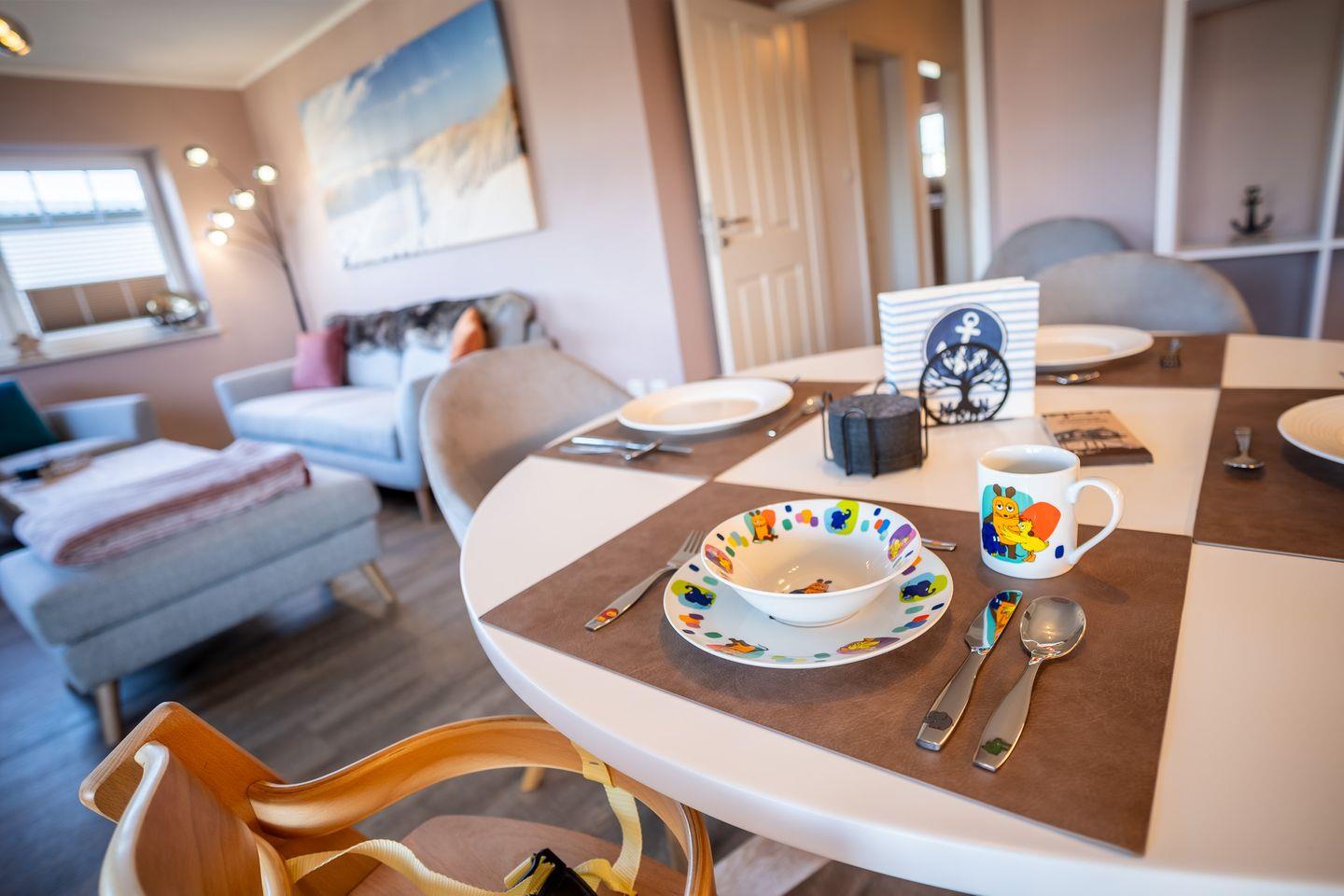 Der helle und freundliche Wohn-Essbereich mit offener Küche ist das Herzstück der Wohnung. Ob gemeinsames Frühstück, gemütliche Abende oder entspannte Stunden bei einem guten Buch – hier werden Sie sich sofort wohlfühlen. Von hier aus gelangen Sie direkt auf den möblierten Balkon. Nutzen Sie den Strandkorb für eine kleine Auszeit oder genießen Sie Ihre Mahlzeiten im Freien. Ein geselliger Grillabend lässt sich hier ebenso herrlich verbringen.