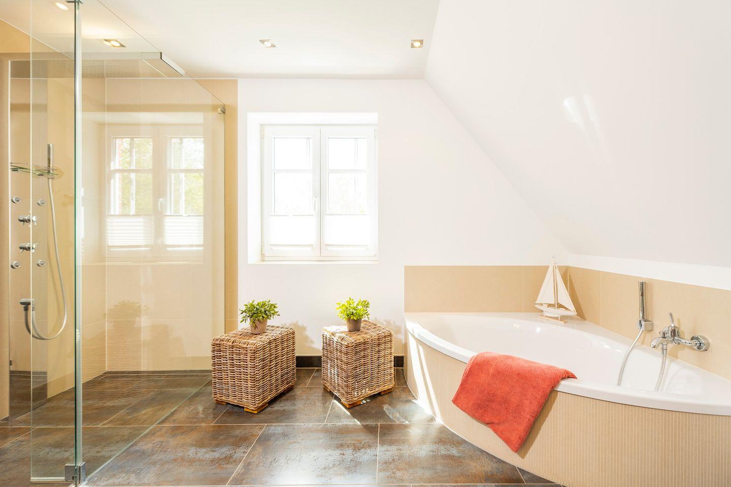 Im 1. Obergeschoss finden Sie zwei Schlafzimmer mit komfortablen Boxspringbetten (180 x 200 cm), ein Schlafzimmer mit zwei Einzelbetten (90 x 200 cm) und ein Badezimmer mit Dusche, Badewanne und WC.