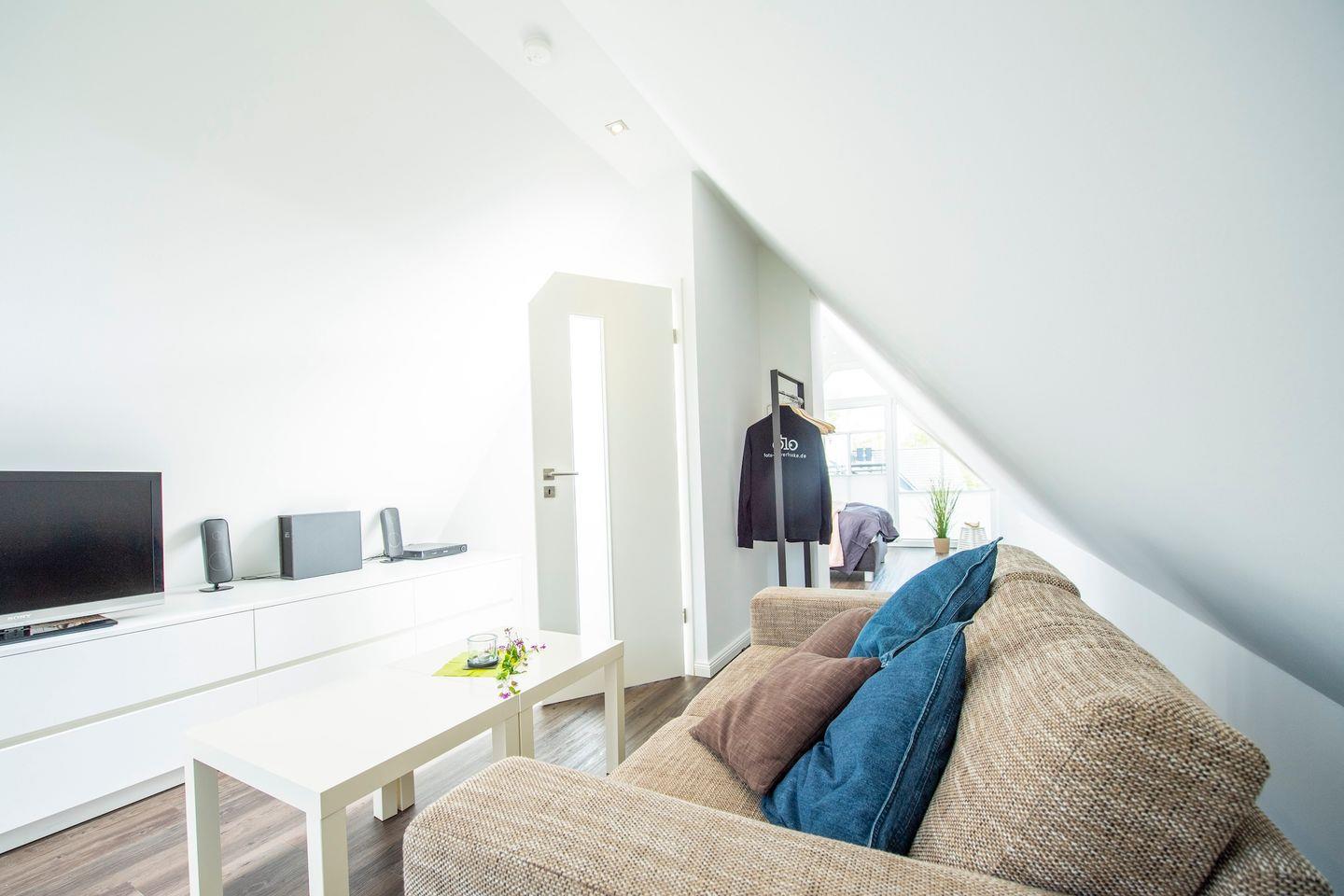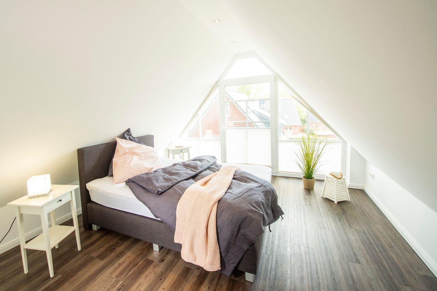Im Spitzboden im 2. Obergeschoss erwartet Sie ein weiters Schlafzimmer mit einem Boxspringbetten (140 x 200 cm) und einer gemütlichen Sitzecke mit Sofa und Fernseher.