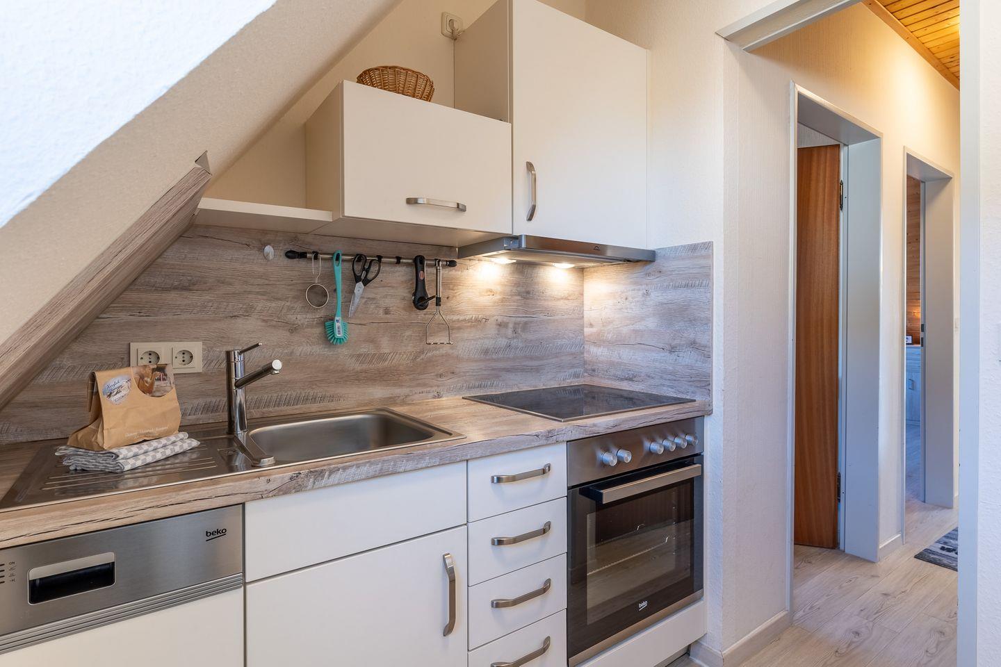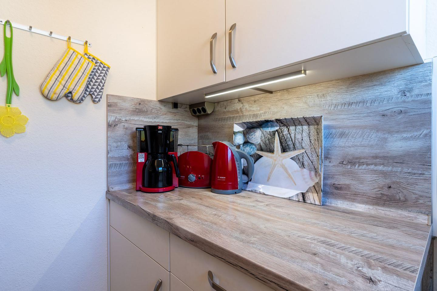 • Küche: Moderne Ausstattung mit Geschirrspüler, Cerankochfeld, Backofen, Kühlschrank mit Gefrierfach, Kaffeemaschine, Toaster und Wasserkocher – ideal für die Zubereitung leckerer Mahlzeiten.