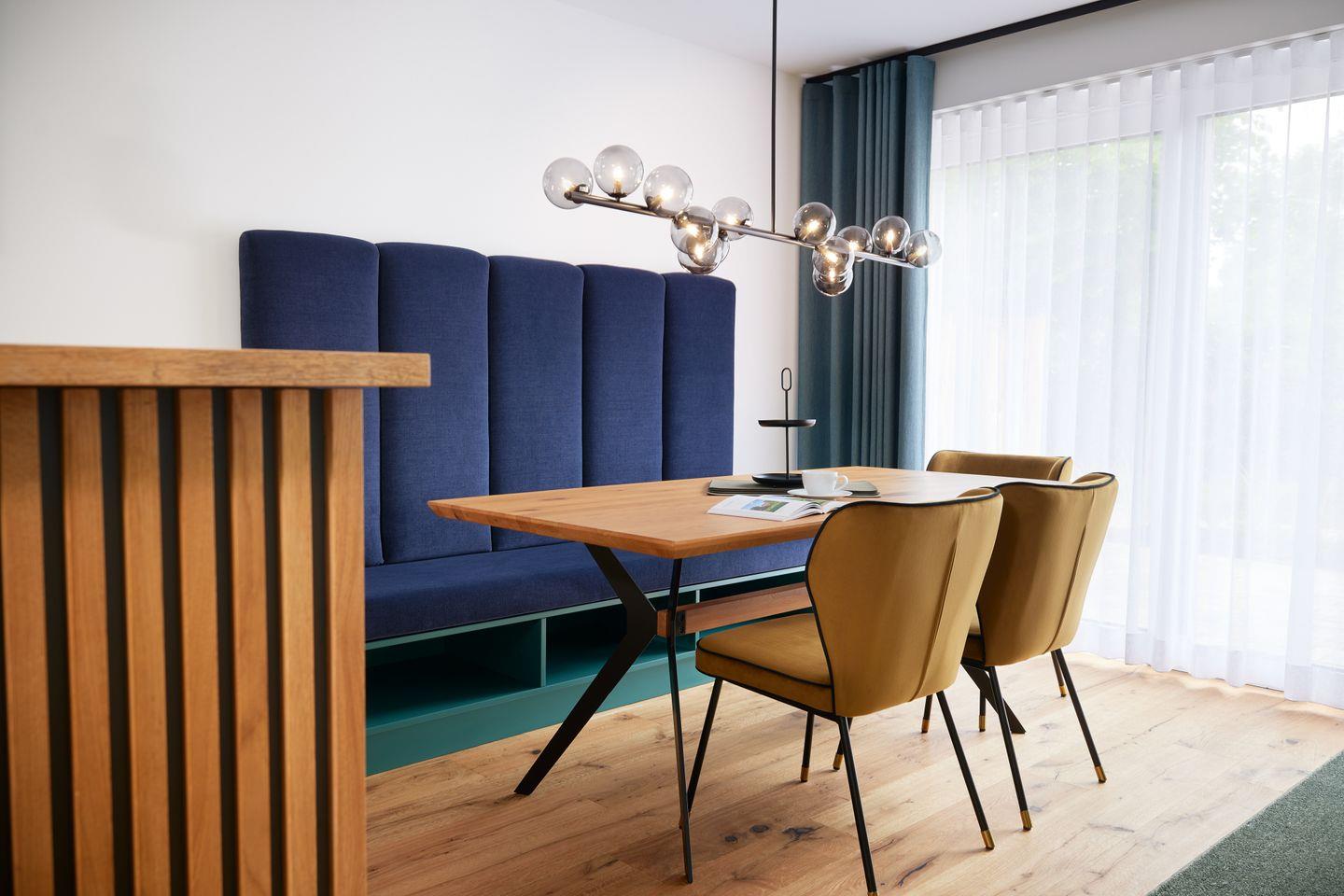 Der Wohn- und Essbereich mit integrierter Küche und Design-Polstermöbeln lädt zum entspannten Zusammensein ein.